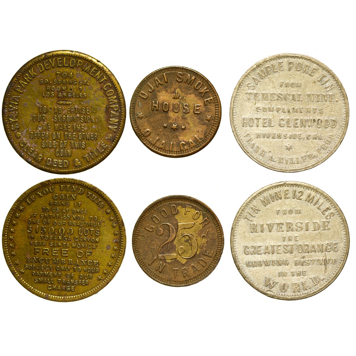 Lot of 3. 1) Topanga Canyon, Sylvan Park Development Co. Good. 2) Temescal Mine Sample Tin, Compliments Hotel Glenwood, Riverside, Cal. Fine. 3) Ojai Smoke House. GF25cIT. Dug, fine. Ojai is the smallest town in Ventura county. A fire destroyed the town in 1917 and gave prominent early settler Edward D. Libbey a fresh start to rebuild. It was featured in the 1939 movie "The Last Horizon" where it represented Shangri-La [ojai.ca.us].