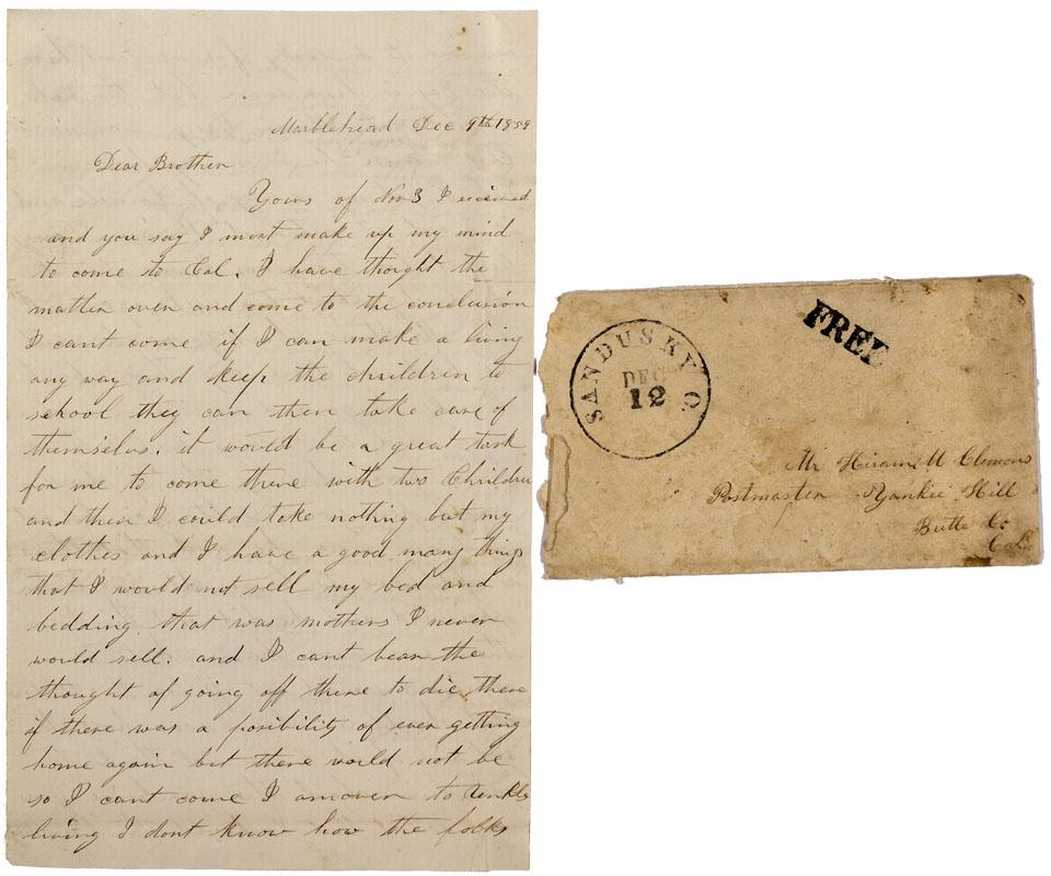 A rare piece of postal history. While the U. S. Congress had established the use of postal stamps by law in March of 1847, the rate continued to be free for drop letters mailed at the office of "delivery" for the addressee to pick up at the same office. Also the service was offered between post offices for official business. This letter is from Mary Dewey in Marblehead, Ohio (and postmarked in Sandusky on 12 December) to her brother Hiram H. Clemens at Yankee Hill, who was the postmaster there [Ref: www.archive.org/stream/cihm_18390/cihm_18390_djvu.tx]. Thus, this is why the letter is marked free. In a previous letter, Clemens had asked Dewey to move to California to be with him. Apparently, her husband died and left her with small children. Dewey said “I have thought the matter over and come to the conclusion I cant [sic] come.” Dewey worried about having to sell personal items such as her mother’s bed in order to move. She worried about the move in general and affect it would have on the family’s health. And, as she said, if she got there she doubted she would ever see home again. She would rather stay and struggle than move. She goes on to talk about Clemens’ collecting money from people in the area who owe him and that maybe he should handle it directly. A very readable, poignant letter. The hand written letter is on white, lined paper, and folded in half to make it 3 pages long. The cover is torn on its left side. It also has foxing and two or three water marks. Good condition overall.