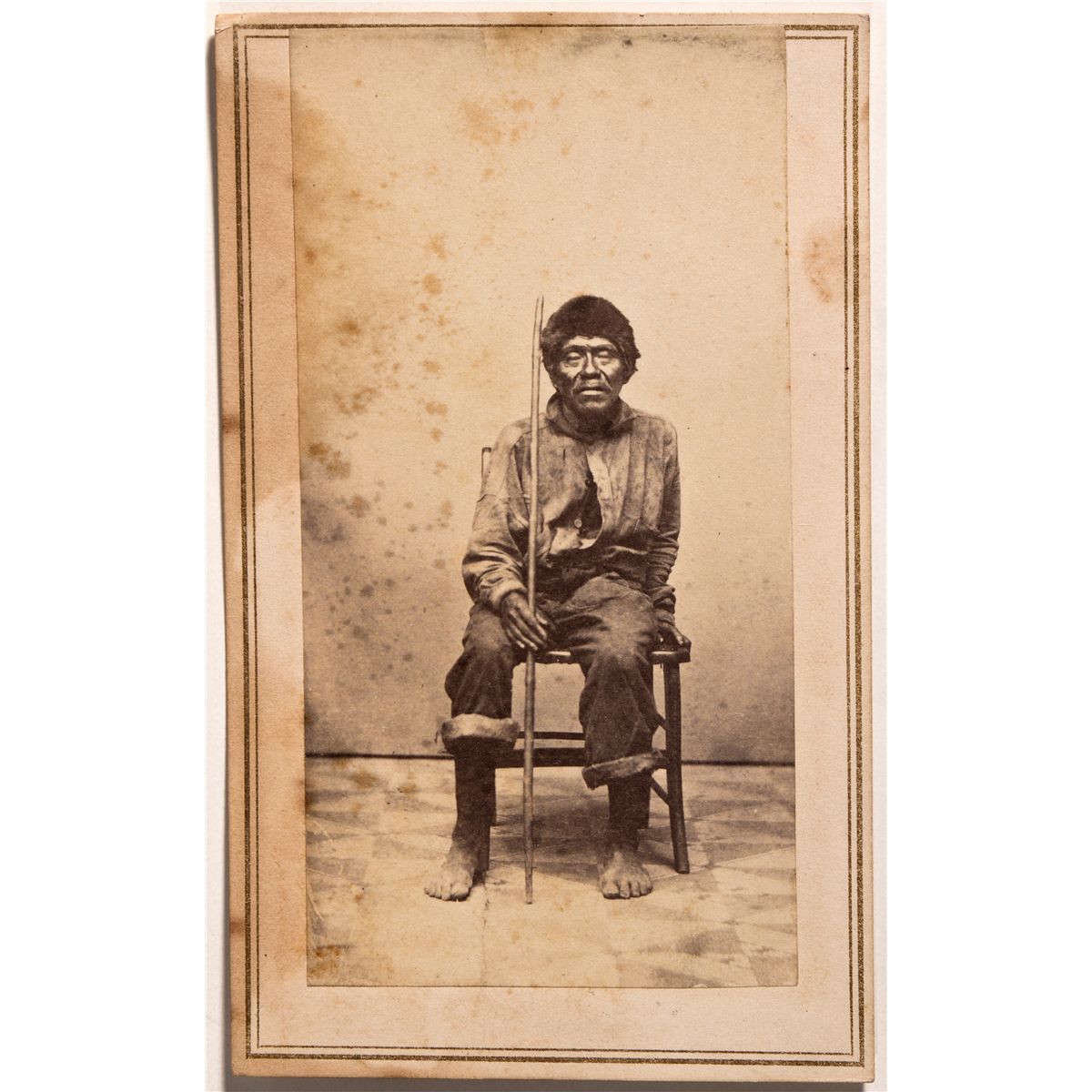 Photograph measures 4” x 2.5” mounted on white matte. Medium contrast and focus is sharp. There are brown age marks that appear on the left and upper right sides. The sides of the matte have little wear. On the back on the matte there is a message in period handwriting that reads “Digger Indian.” It is therefore unknown the tribal group the man in the photograph was associated with. The term “digger Indian” was created by Euro Americans as a generalized stereotypical definition loosely applied to Natives whom they believe dug for food. Therefore, the term was applied to many Northern Nevadan and Central Californian Natives, despite their cultural differences. The man sits for a photograph in a chair, holding a stick. He is barefooted and wears Euro American clothing. [ Lonnberg, Allan. “The Digger Indian Stereotype in California”, Journal of California and Great Basin Anthropology . Page 215. 1981].