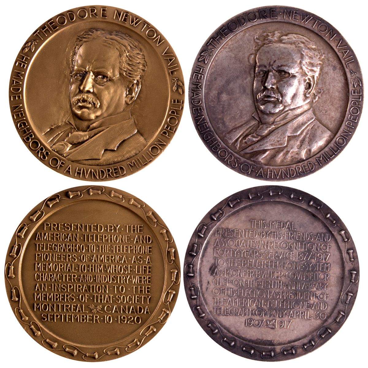 Lot of 2. 1) Silver, created to celebrate 10 years of Theodore Newton Vail's presidency. 2) Bronze, created in memory for Vail after his death. Vail was president of the American Telephone and Telegraph Company from 1885-1889 and again from 1907-1919. - Weber Collection