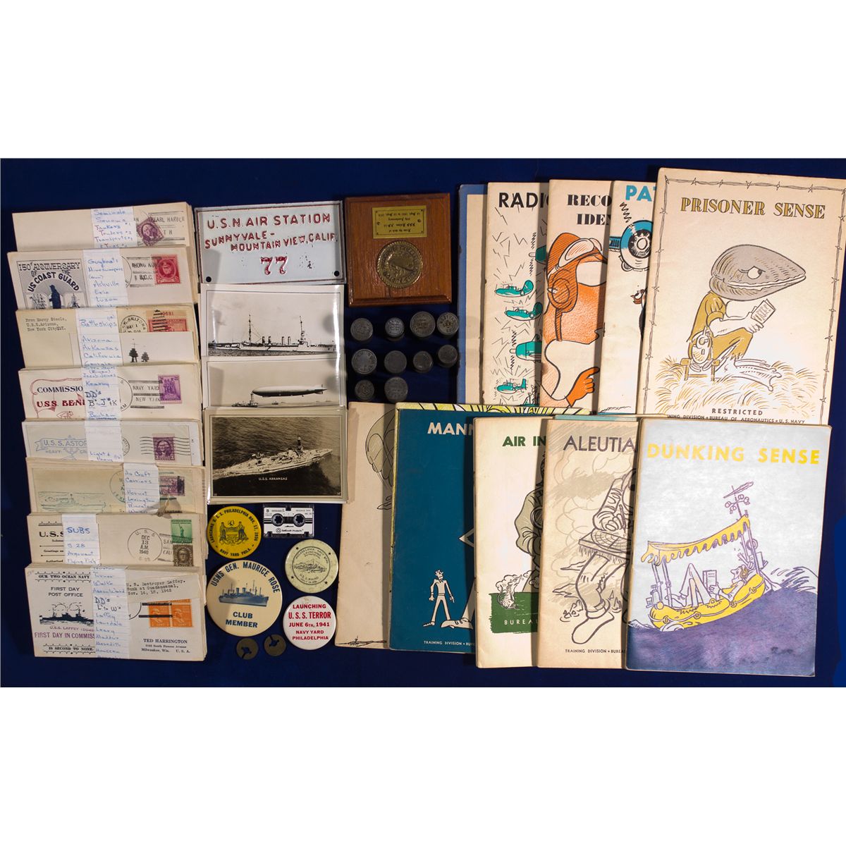 Lot of over 200 items. Includes, over 150 letters, 20 photographs of naval ships,1 message tape, 4 pins, 1 token, 1 USN Air plate, 7 token dies, 16 naval educational themed paperback books and 1 commemorative medal for the 35th anniversary of the U.S.S. Alton. Some wear. - Weber Collection