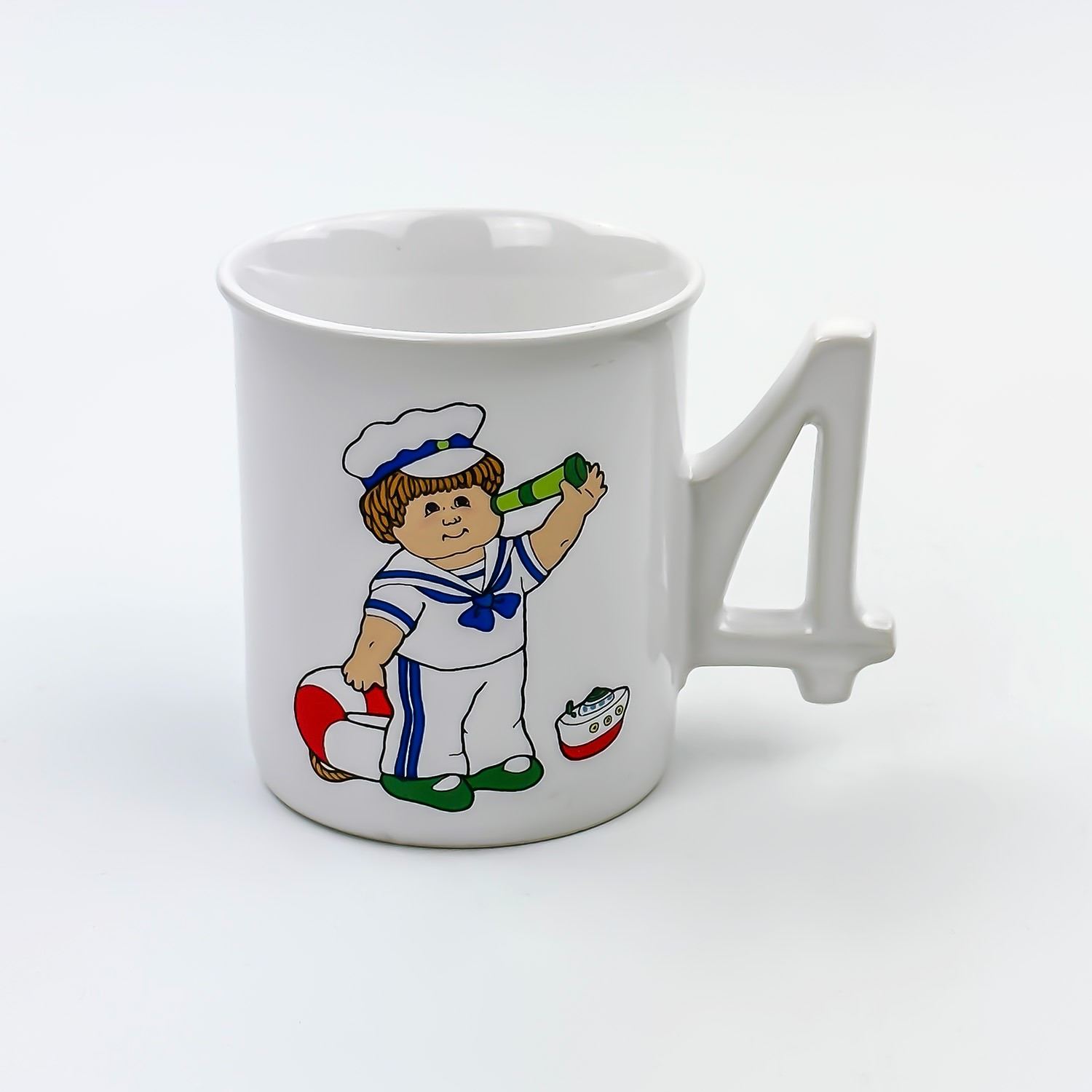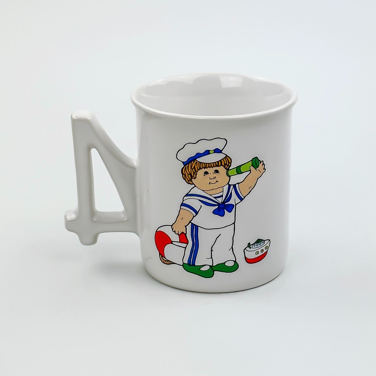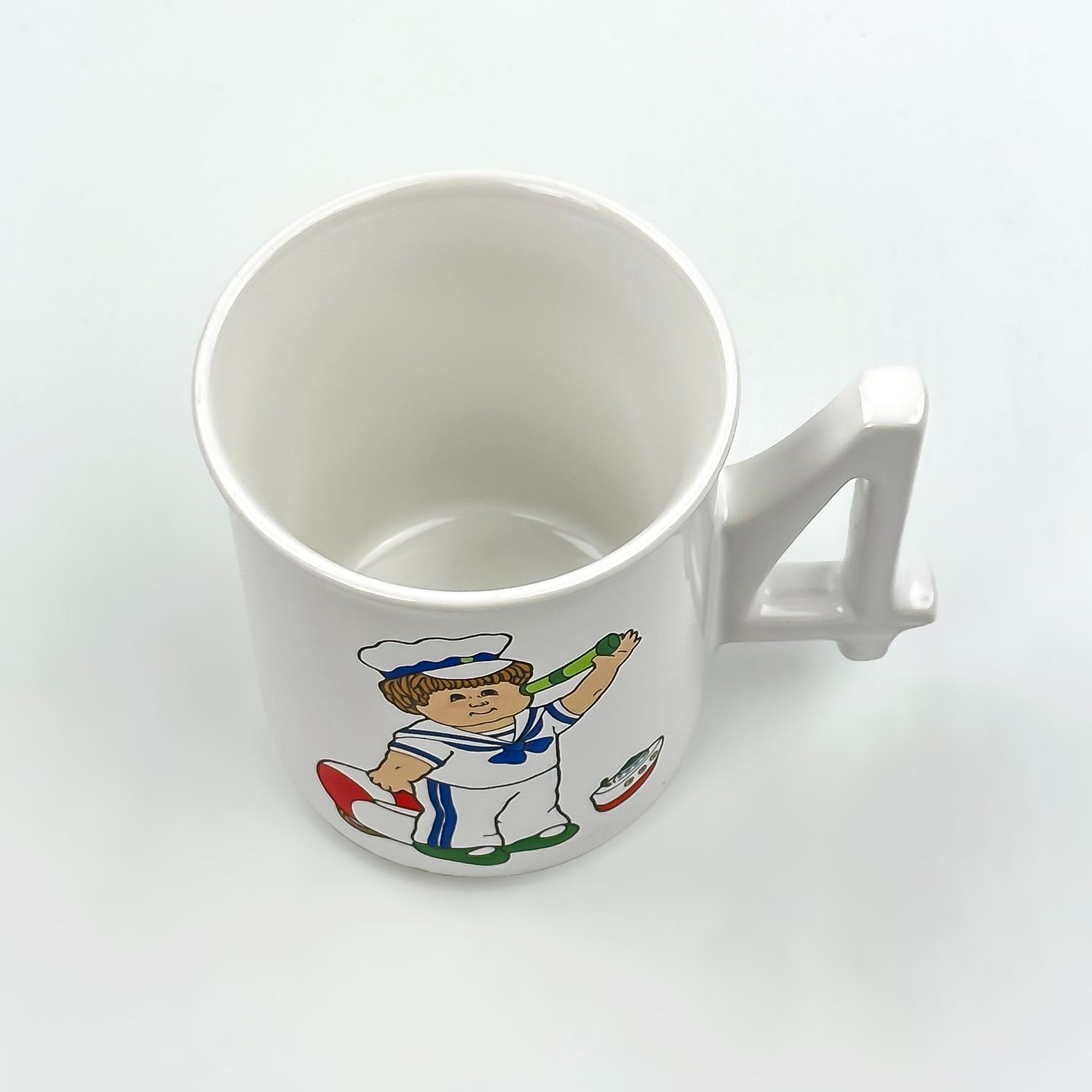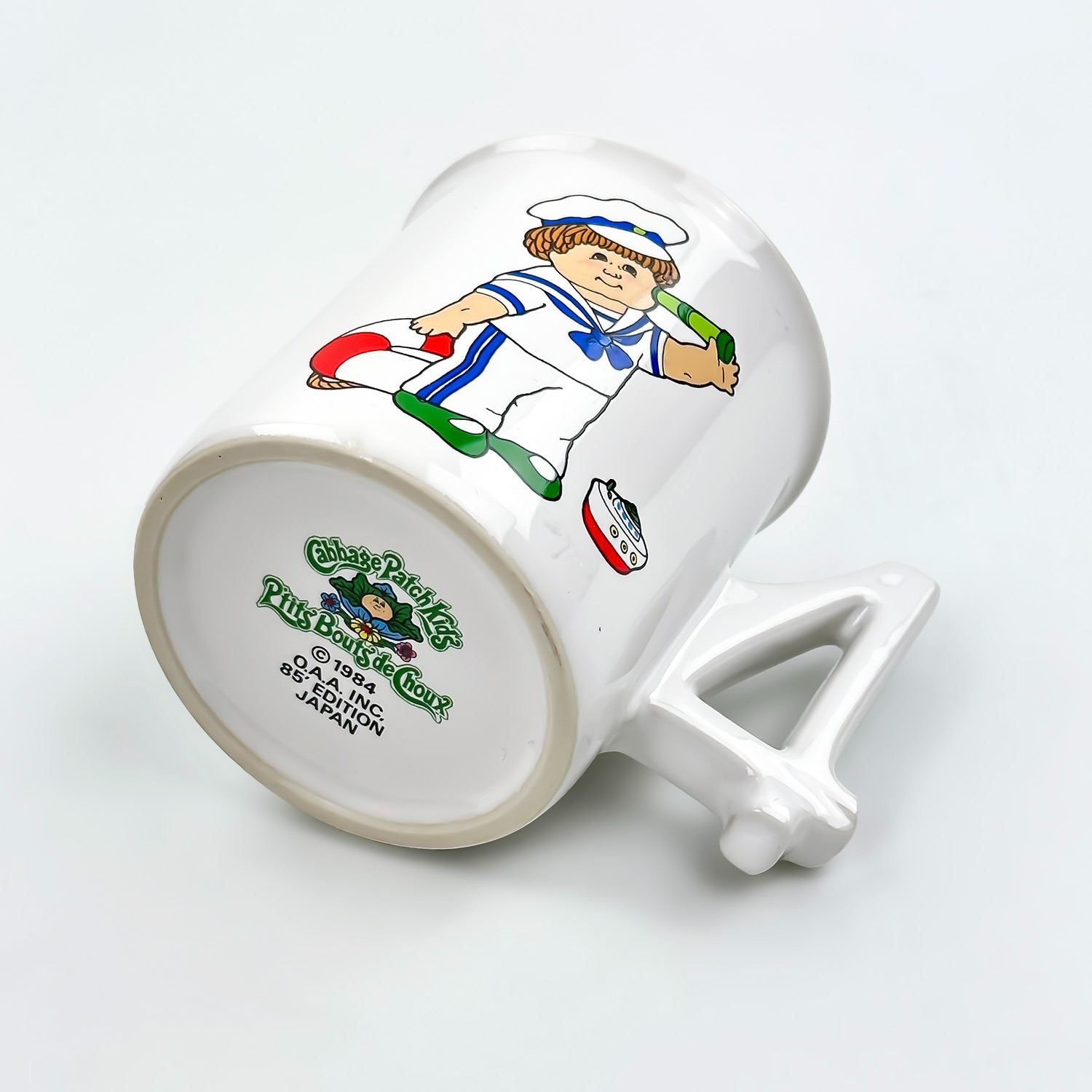#8336 - CABBAGE PATCH KIDS - LITTLE BOY SAILOR THEME - KIDS AGE 4 HANDLED MUG. COPYRIGHT 1984 O.A.A. INC. 85’ EDITION JAPAN. MEASURES: 4” (10 CM) WIDE WITH HANDLE BY 2.75” (7 CM) DIAMETER AND SITS 3.125” (8 CM) HIGH
