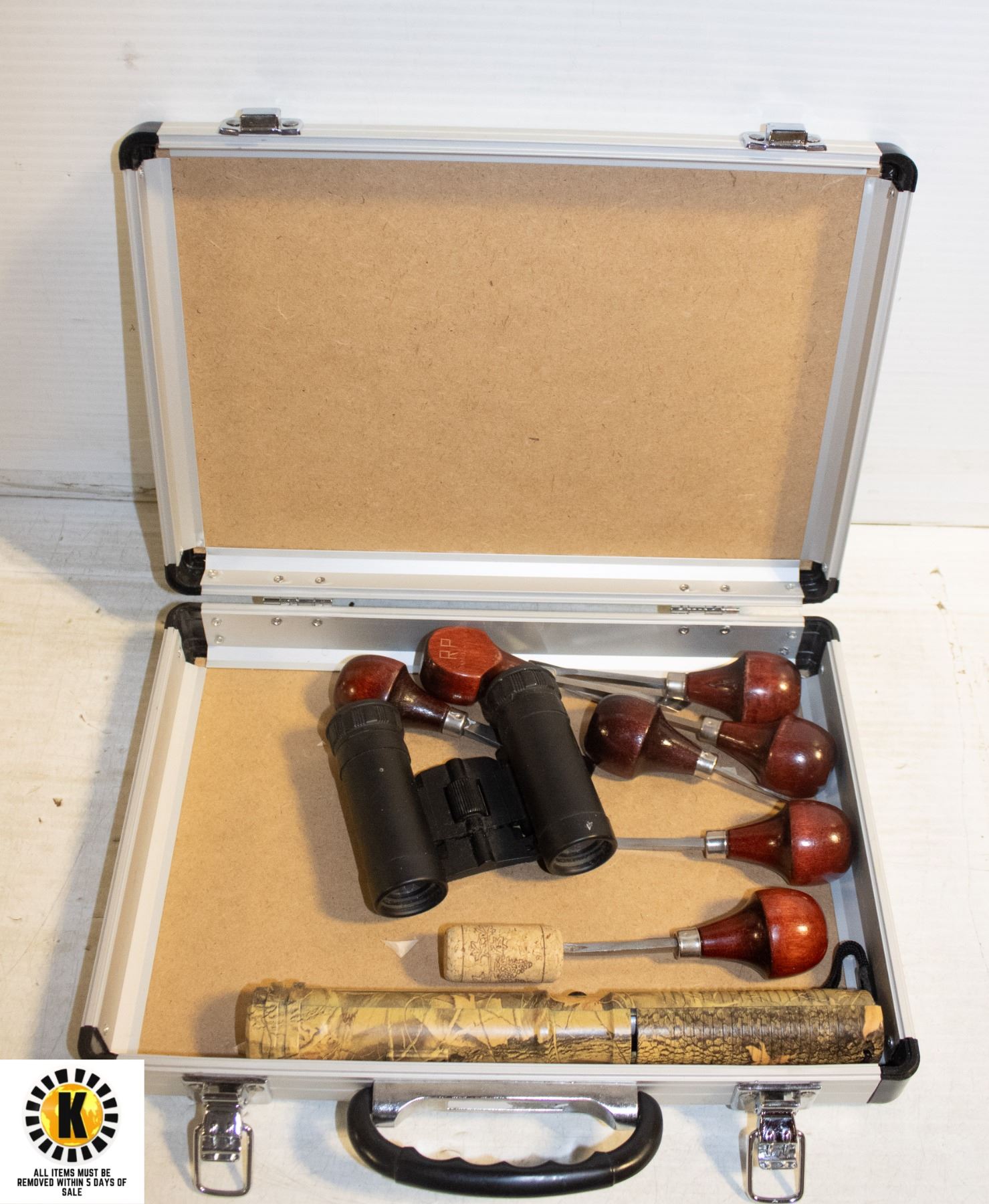 CABELAS BOX WITH WOOD CARVING TOOL SET, BINOCULARS