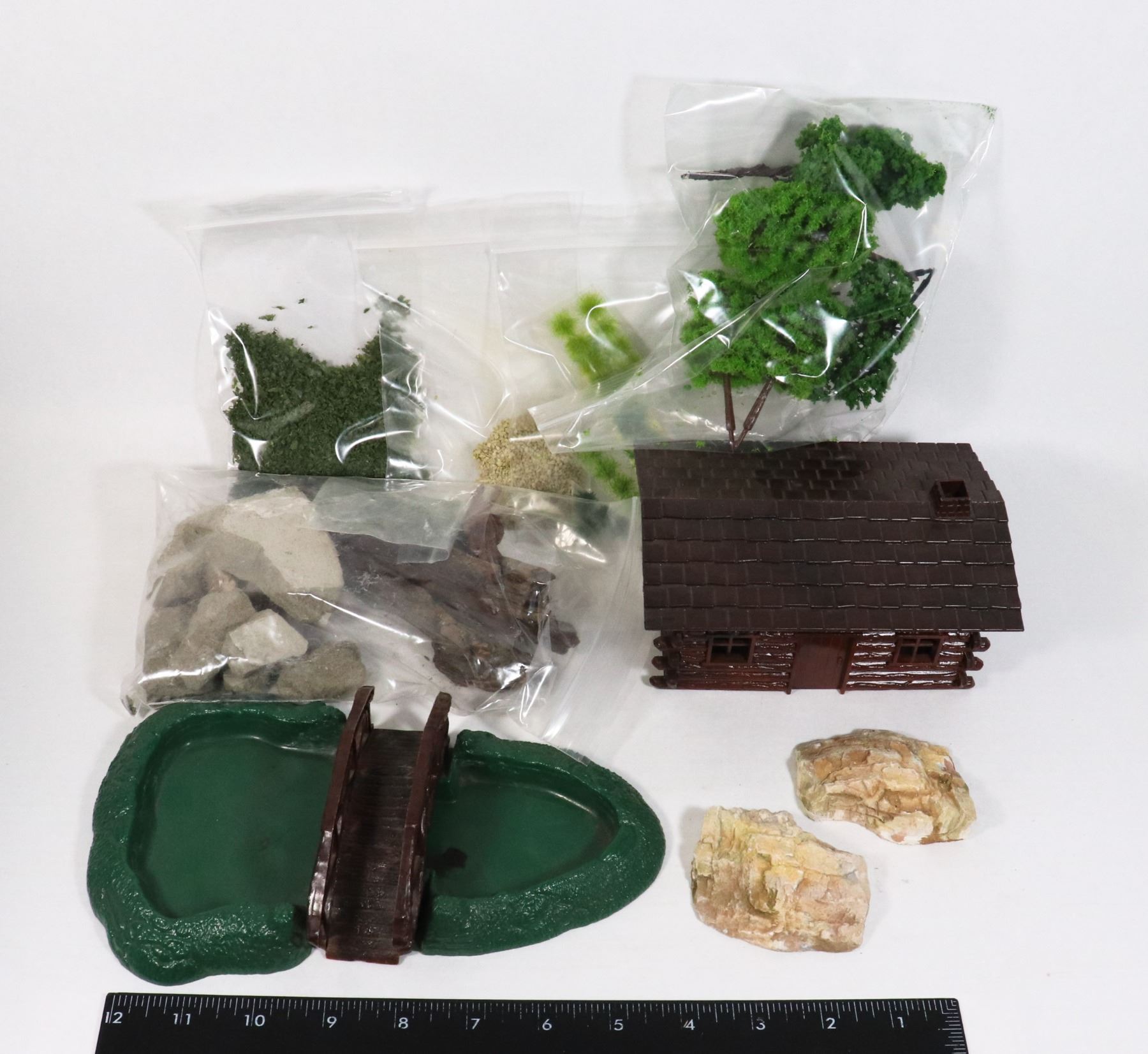 TREES, FLAT BOTTOM HOME, MADE ROCKS, MOSS, BRIDGE OVER POND, FLOCK, LOGS, GRASSES. INSTRUCTIONS AND GLUES NOT INCLUDED