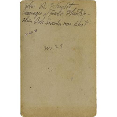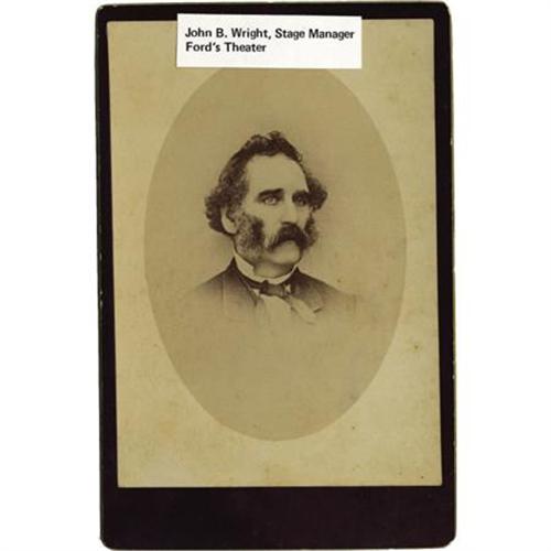 <B>JOHN B. WRIGHT CABINET CARD, FORD'S THEATRE STAGE MANAGER, CIRCA 1880-1890.</B></I> Wright was the stage manager at Ford’s Theatre the day that President Lincoln was assassinated. On verso of this cabinet card in period pencil; <I>John B. Wright manager of Ford Theatre when Pres Lincoln was shot</B></I>. No photographer noted. <BR><BR><B>Provenance: </B></I><I>Al. Emmett Fostell Collection</B></I><B><I> </B></I></B></I><BR><B><BR>Condition:</B></I> Very fine, white affixed identification label on front.<BR><BR><b>Shipping:</b> Miscellaneous Collectibles, Smal (<a target="_blank" href="http://www.heritageauctions.com/common/shipping.php">view shipping information</a>)