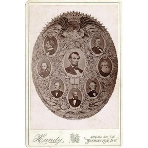 <B>CABINET CARD OF PRESIDENT LINCOLN AND HIS CABINET, 1865.</B></I> Wonderful and scarce, original 1865 cabinet card, a photograph of a calligraphic work of art featuring the signatures of Abraham Lincoln and the members of his cabinet. This interesting photo measures approx. 6.5" x 8". The image is a photograph of a fantastic calligraphic construct with a large eagle at the top perched on a shield with crossed American flags in the background. Below the eagle is a central, oval “frame” containing the signature of Abraham Lincoln. Surrounding this central oval are individual oval areas containing the signatures of the members of Lincoln’s Cabinet - Edwin Stanton, William Seward, William Fessenden, Edward Bates, William Dennison, Gideon Wells, and James P. Usher. There is also a copyright notice dated 1865 by Edwin P. Hill (likely the photographer). Please note - this is a photograph of the signatures<B> </B></I>and the photo is not actually hand-signed by Abraham Lincoln or the members of his cabinet. <BR><BR><B>Provenance: </B></I><I>Al. Emmett Fostell Collection</B></I><B><I> </B></I></B></I><BR><BR><B>Condition:</B></I> Very fine.<BR><BR><b>Shipping:</b> Miscellaneous Collectibles, Smal (<a target="_blank" href="http://www.heritageauctions.com/common/shipping.php">view shipping information</a>)