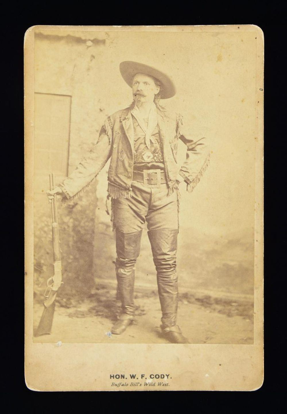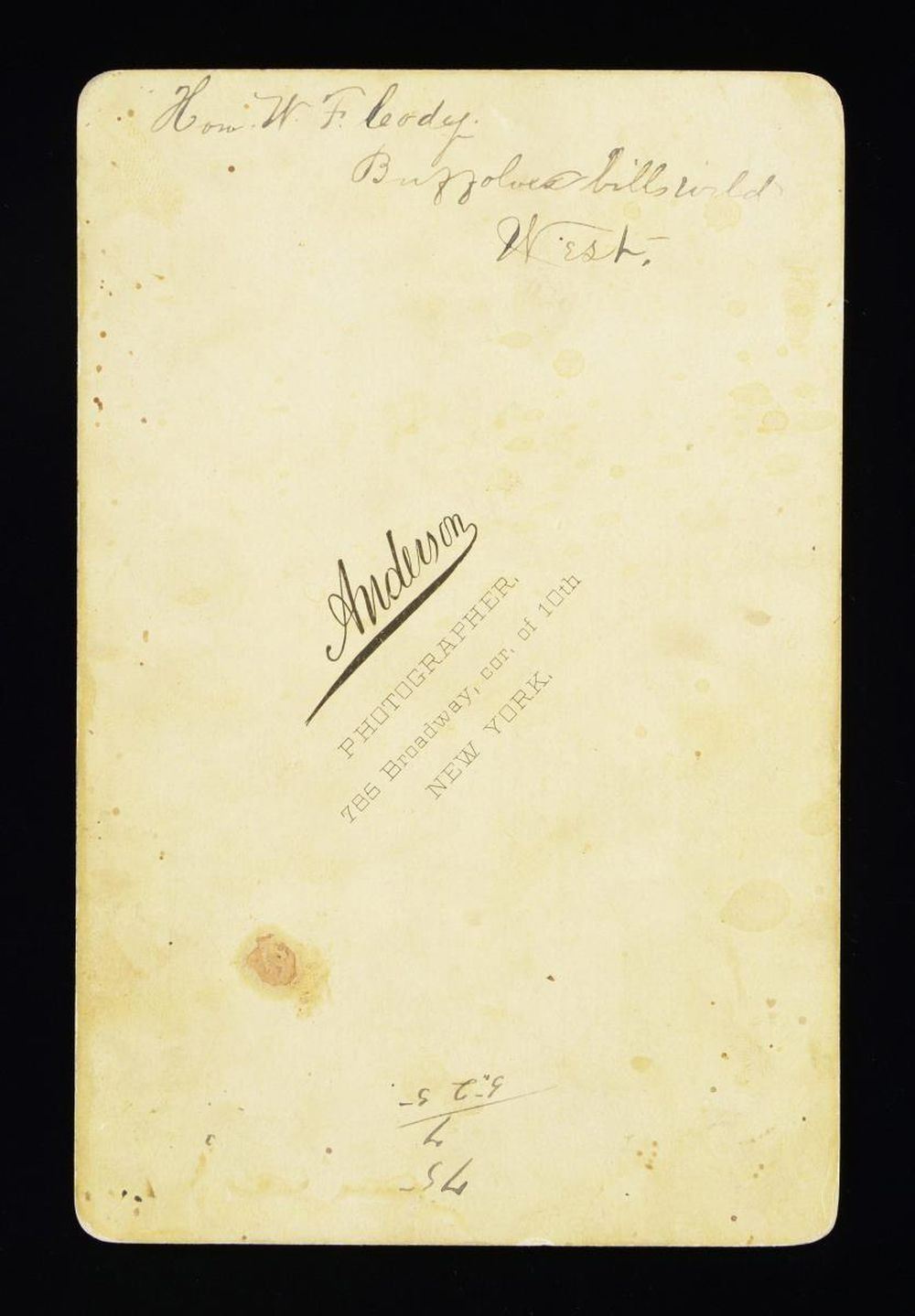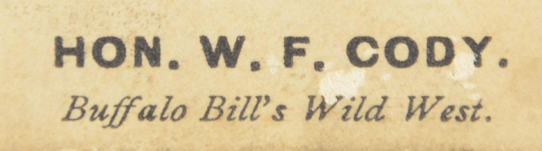 This card measures 6 1/2" x 4 1/4" and depicts a full-standing Cody in Western garb typical of his Wild West show. He has a large Western hat and looks toward his right with a rifle in his right hand. The photograph reads “HON. W. F. CODY. Buffalo Bill’s Wild West”. The reverse of the card is marked “Anderson PHOTOGRAPHER, 785 Broadway, cor. of 10th NEW YORK”. The top of the reverse has an ink inscription that reads “Hon. W. F. Cody. Buffoloes bill’s wild West.”. CONDITION: the card has some minor staining and a bit of soiling, but the image remains crisp & clear, and there are no creases or losses. (02-20977/BF). $600-900.