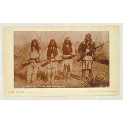 CABINET CARD PHOTO OF GERONIMO, HIS SON, AND TWO APACHE BRAVES. 8-1/2” x 5-1/4” cabinet card by Elite Studio of San Diego, California depicting Geronimo and three braves, one of them his son. It is an outdoor setting in the Southwest, from the appearance of the vegetation. While the two braves at the left have opted to carry Winchester repeaters, Geronimo and the man closest to him are carrying a Springfield trapdoor rifle and carbine - accurate single-shot rifles with tremendous stopping power. CONDITION: Good to very good with only minor soiling and wear. 4-50107 SO8