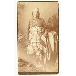 CABINET CARD PHOTOGRAPH OF APACHE CHIEF. 7” x 4” cabinet card photo by F. E. Evans’ Views and Curios, East Las Vegas, N.M. Written in ink on the back "A Chief of Geronimo’s Band.” Studio portrait of an old chief in a shirt, blanket and tall moccasins posing with what may be a Frank Wesson rifle. CONDITION: Very good, with little soiling and slight edge wear. 4-50103 SO12