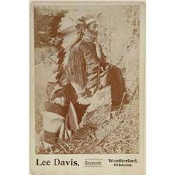 CABINET CARD PHOTOGRAPH OF GERONIMO’S YOUNGEST SON AND HIS NEPHEW. 6-1/2” x 4-1/4” cabinet card by Lee Davis of Weatherford, Oklahoma. On the back, written in ink "Geronimo’s youngest son and nephew. Geronimo is chief of the Apaches and cost the U.S. more money than nearly all the Indians combined.)” The man and boy were posed on the bank of a stream. Geronimo’s son is wearing a headdress more appropriate to a Plains Indian - a very common prop used by photographers of the period to sell photos to Easterners who expected all important Indians to wear war bonnets, etc. CONDITION: Excellent, w/ very little soiling. 4-50113 SO14