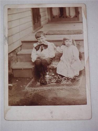 CABINET PHOTO OF 2 CHILDREN SITTING ON STEP W/ HORSE DRAWN STEAM FIRE ENGINE;
