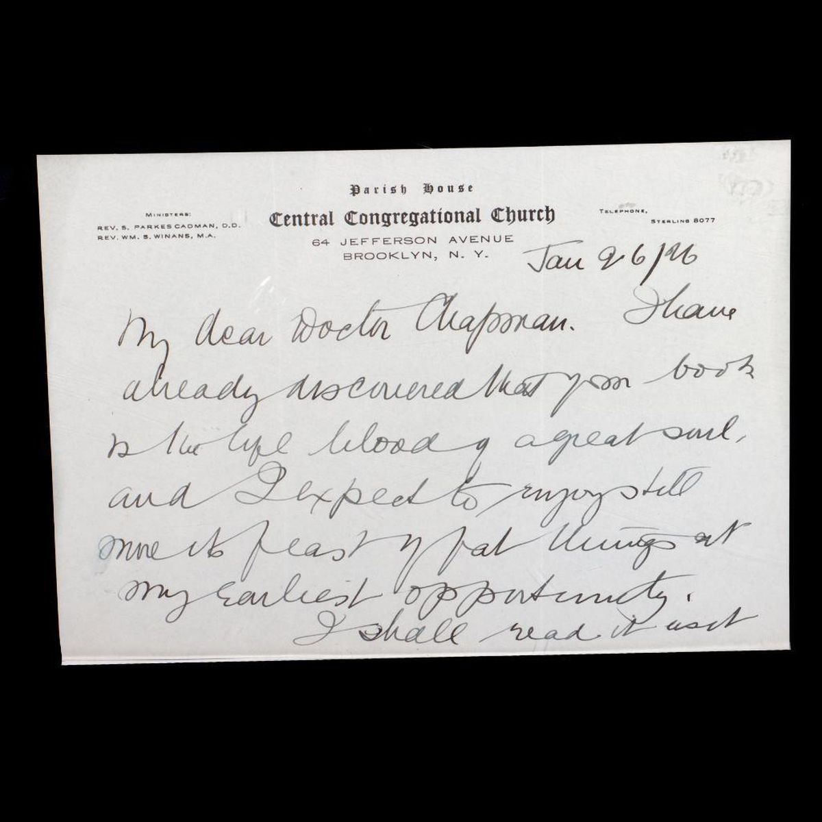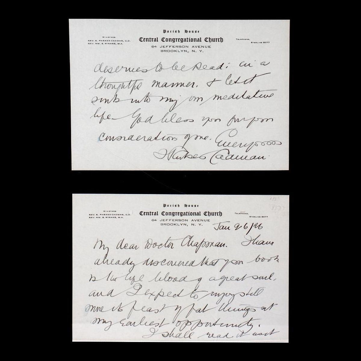 A two-sheet ALS on letterhead of the Central Congregational Church, Brooklyn, New York, to Edward M. Chapman, January 26, 1926. The Rev. Cadman thanks Chapman for his book (A Modernist and His Creed, 1926), and says he will "read it as it deserves to be read: in a thoughtful manner." 6in. x 8 5/8in. Condition: Very good; two slight vertical folds on each sheet. PLEASE NOTE: 20TH CENTURY DOCUMENTS CAN HAVE VARIED TONING FROM AGE; IMAGES MAY APPEAR LIGHTER ON DIFFERENT SCREENS. EDWARD MORTIMER CHAPMAN (1862-1952) was a Connecticut pastor, academic, and author. He graduated from Yale Divinity School in 1890. Chapman was a descendant of Robert Chapman, one of the first settlers of Saybrook, Connecticut (c. 1635). He served as pastor of Old Lyme Church from 1906 to 1915. Chapman€™s works integrated his wide-ranging theological, literary, and historical interests. This lot and the other Chapman-related documents offered in this sale were part of a collection of his family papers.
