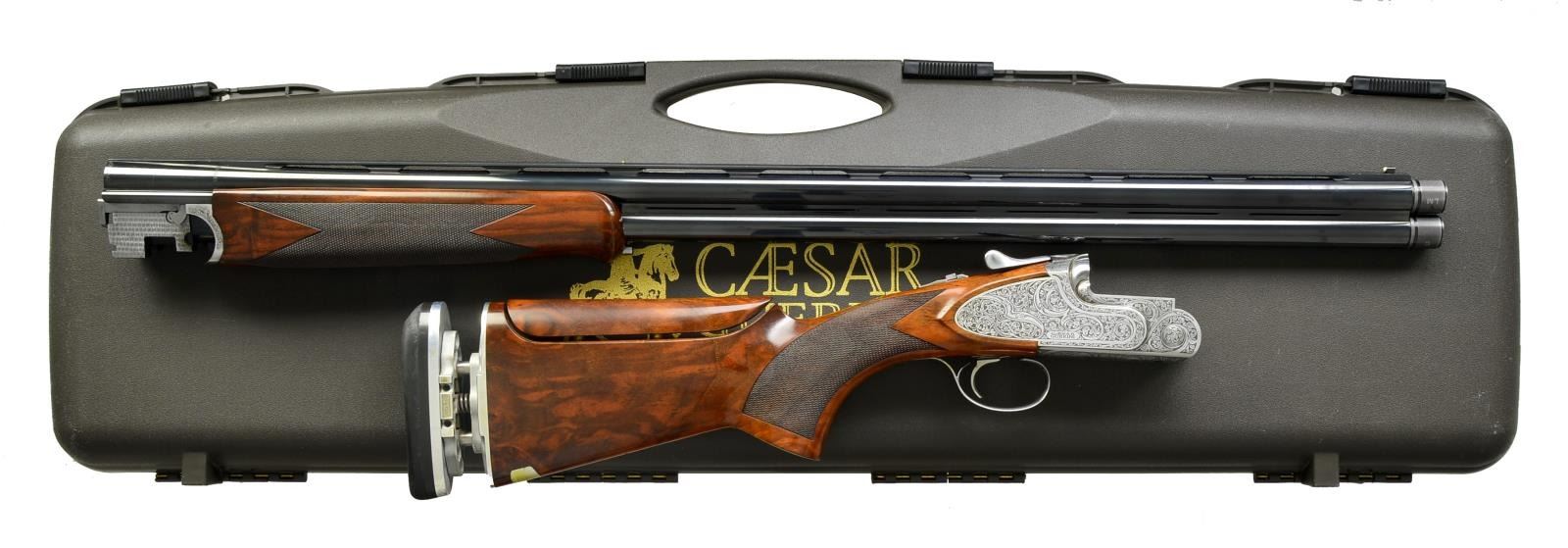 Cal. 12 Ga., 2 3/4". S# 106772. Bbls. 31 7/8" w/ VR, vented side ribs, white front bead, brass mid bead & interchangeable chokes. Coin finished sideplated action w/ deep relief floral scroll ornamentation. Checkered SST. Selective ejectors. Schnabel tipped forearm & pistol grip stock of fancy walnut w/ a borderless cut checkering. Stock features left side palm swell, adj. comb & R. A. D. recoil reducing system w/ black Kick-Eez pad. LOP: 14". This gun has a left hand palm swell. The adj. butt makes it useable right handed w/ adj. to heel plate. UNATTACHED ACCESSORIES: Caesar Guerini molded hard case. Includes total of 8 extended choke tubes consisting of Imp. Mod, Mod, 2 Light Mod. , IC, Skeet & 2 Cyl. CONDITION: over 98% metal finish. Stock shows spots of light wear & scattered handing marks. Stock has hairline cracks extending from the sideplates into the checkering. Very good bright bores. Sound mechanics. (20-1910/DS). MODERN. $2,750-3,500.