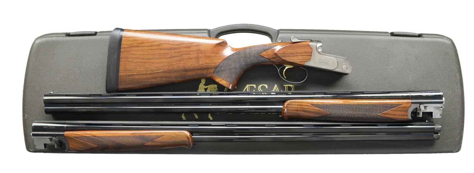 O/U SHOTGUN. Cal. 20 Ga, 2 3/4" & 28 Ga., 2 3/4". S# 105540. Both bbls. 31 7/8" w/ VR, vent side ribs & individual forearms. 28 Ga. bbls. include Mod. & Light Mod. choke tubes, 20 Ga. bbls. include IC & Light Mod. choke tubes. White target front sights w/ brass mid beads. Boxlock action w/ Neo-Modern engraving having gray "Tinaloy" finish. Checkered gold finished SST. Auto Ejectors. Schnabel tipped forearms & pistol grip stock of checkered walnut w/ attractive dark streaked grain. LOP: 14" over solid black Kick-Eez pad. This gun is for a left hand shooter w/ left hand palm swell. It is also cast on about 1/2". UNATTACHED ACCESSORIES: Caesar Guerini 2 bbl. set hard case. CONDITION: over 98% metal finish. Stocks have good finish showing sm. scuffs. Bores show some plastic fouling. (20-1908/DS). MODERN. $3,000-4,000.