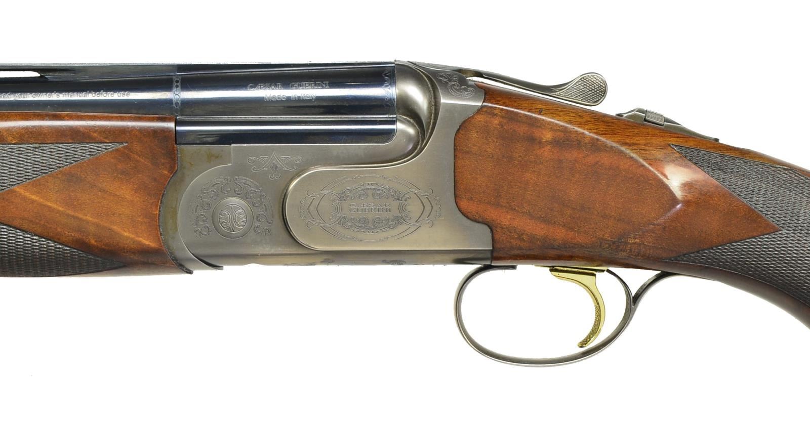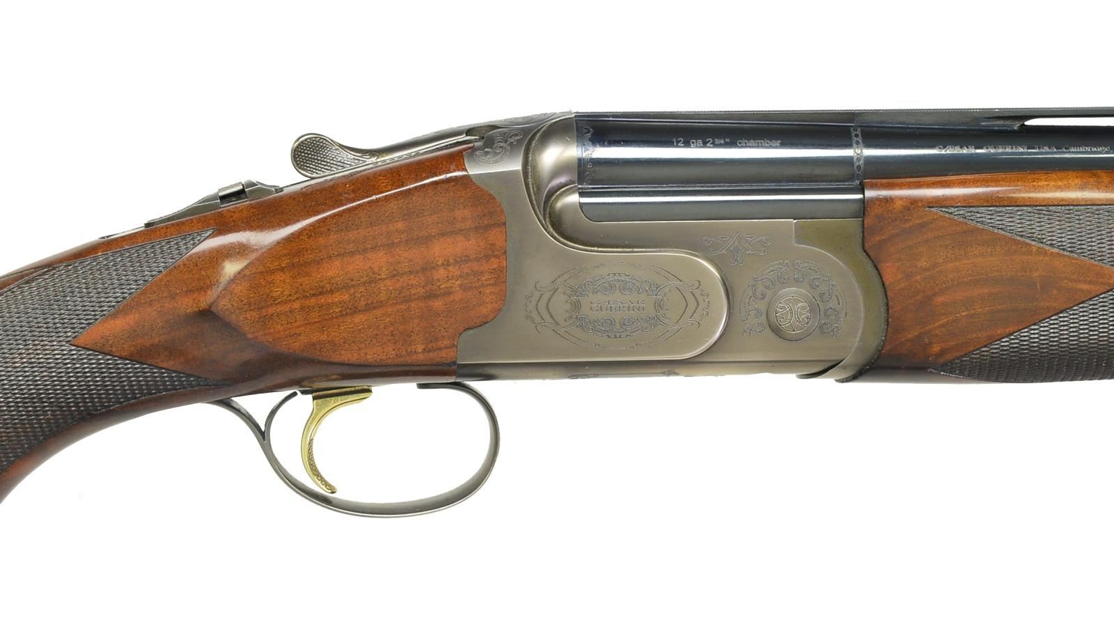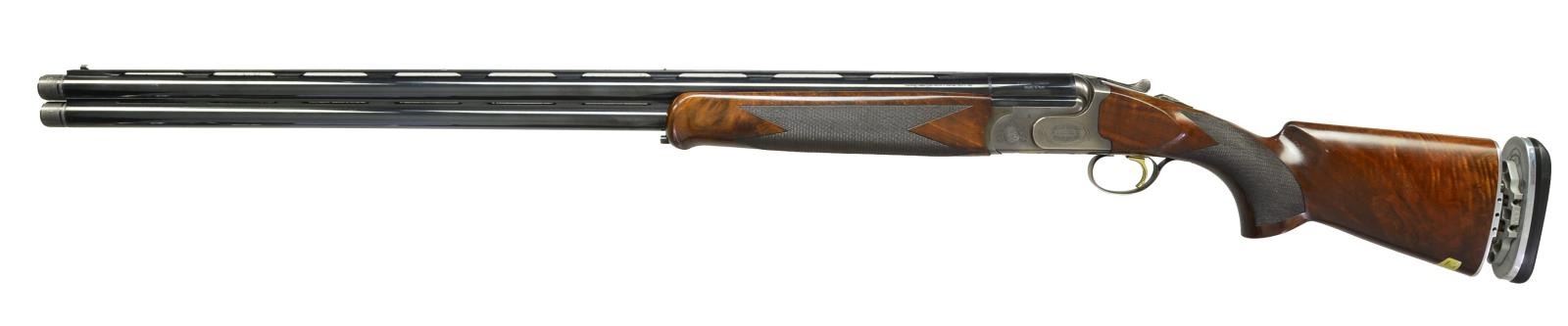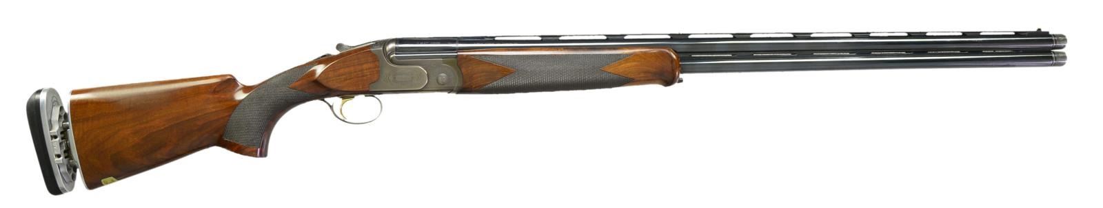 Cal. 12 Ga., 2 3/4". S# 103989. Bbls. 31 7/8" VR w/ vented side ribs, white target front sight & brass mid bead. Includes 2 extended IC choke tubes. Boxlock action w/ Neo-Modern engraving having gray "Tinaloy" finish. Gold finished checkered length adj. SST. Selective ejectors. Schnabel tipped forearm & pistol grip stock of checkered walnut w/ palm swell on left side of wrist. LOP: 14" over an R. A. D. recoil reduction system w black Kick-Eez pad. This gun has a left hand palm swell. The adj. butt makes it useable right handed w/ adj. to heel plate. UNATTACHED ACCESSORIES: Plano Protector black molded case. 2 Mop type snap caps. CONDITION: over 97% metal finish. Original stock finish shows sm. marks. Sound mechanics. Very good bores. (20-1909/DS). MODERN. $2,000-3,000.