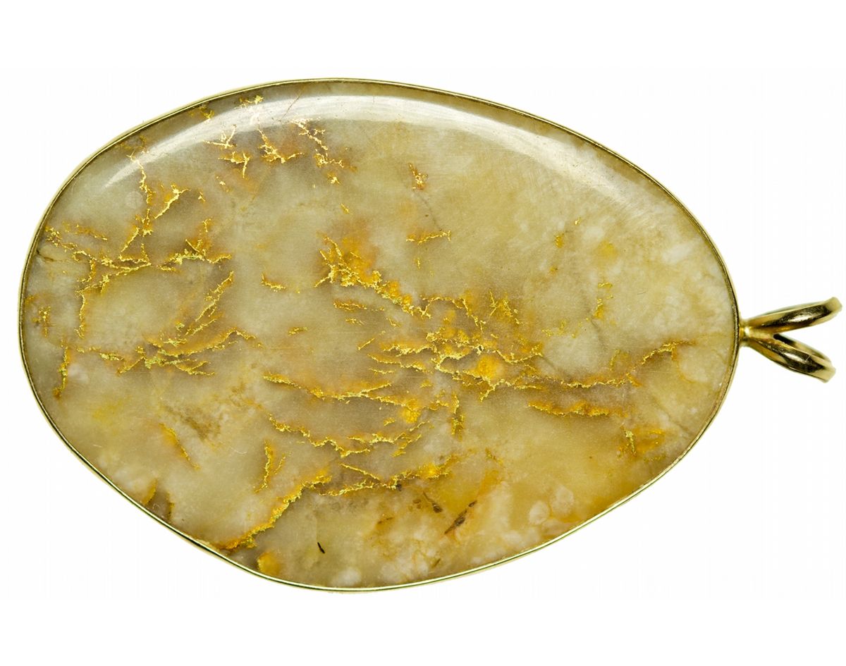 This is a beautiful gold quartz pendant with 0.63 troy oz. of gold in veins and flecks. Piece measures 2"x 1.25" and has, banded in gold and has a hanger attached. This is a solid piece.
