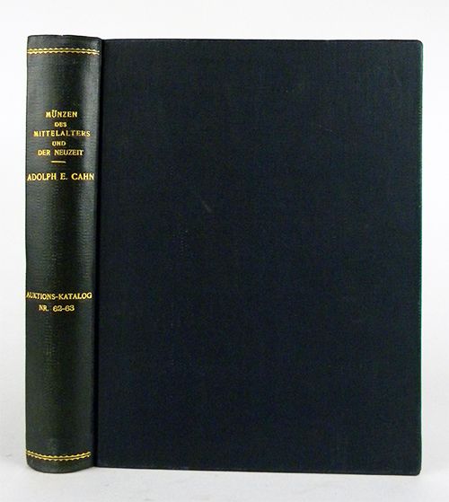 Cahn, Adolph E. RHEINISCHE SAMMLUNG VON MÜNZEN DES MITTELALTERS UND DER NEUZEIT. I. TEIL. RHEINISCHE SAMMLUNG VON MÜNZEN DES MITTELALTERS UND DER NEUZEIT. II. TEIL.: KÖLNISCHE PRIVATSAMMLUNG HERVORRAGENDER SERIEN KÖLN, BARBAREN, VÖLKERWANDERUNGSZEIT, ORDEN UND EHRENZEICHEN. Frankfurt am Main, 15. Januar 1929 und folgende Tage; 15. April 1929 und folgende Tage. Two catalogues bound in one volume. 4to, later blue cloth, gilt. (2), iv, 131; (4), iv, 192 pages; 2272 + 3050 lots; 32 + 62 fine plates. Near fine. Clain-Stefanelli 6630. Spring 76.