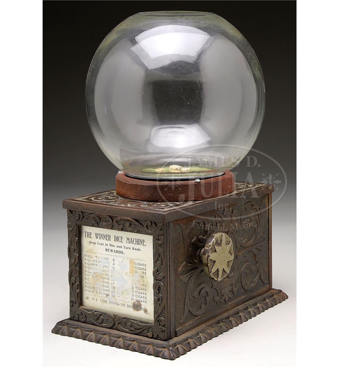 A neat elaborately cast iron gambling machine from the turn of the century, manufactured by the Caille Brothers of Detroit, Michigan. When a penny or a nickel is deposited in the slot and the knob is turned, 5 dice would pop up. Rewards were paid by totaling the sum of the dice and comparing to the award card on the front of the machine. Lacking original glass globe and iron bezel ring, machine is currently "jammed" and lacking key for rear door. SIZE: 6-1/2" w x 9-1/4" d. CONDITION: Castings are intact yet original finish is very weak. Original paper label is present but shows some distress. 1-13494
