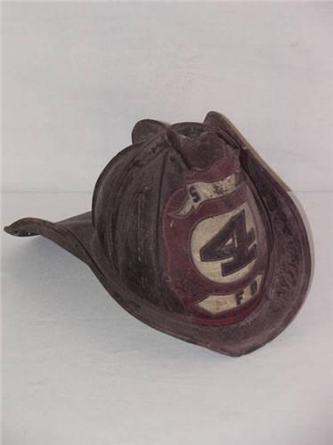 CAIRNS BLACK LEATHER HIGH EAGLE FIRE HELMET W/ RED FRONT and CUT-OUT LETTERS STEAMER 4 F.D. (MISSING LETTERS) - DRY and BRITTLE, LOSSES;