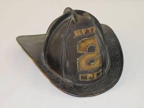 CAIRNS BLACK LEATHER HIGH EAGLE HELMET NEPTUNE #2 MJM CUT-OUT LETTERS ON FRONT SHIELD-HARTFORD CT VOLUNTEER - CRACK IN LEATHER ON BACK BRIM, WEAR and LOSS TO RIM W/ WIRE EXPOSED;