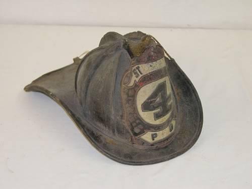 CAIRNS BLACK LEATHER VENTILATED HIGH EAGLE HELMET W/ RED LEATHER FRONT - STEAMER #4 PFD - CUT LETTERS MISSING, BRITTLE W/ REAR BRIM WIRE EXPOSED, DAMAGE;