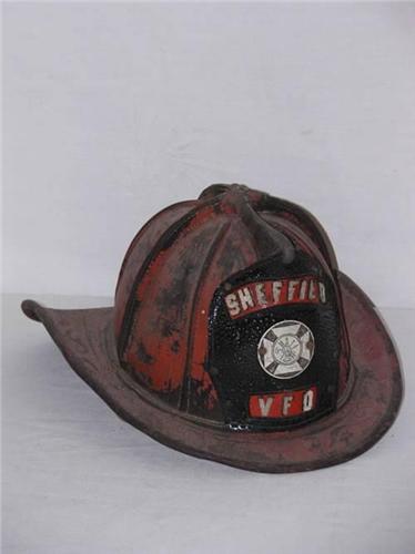 CAIRNS RED LEATHER FIRE HELMET - SHEFFIELD VFD ON FRONT LEATHER SHIELD - "L" MISSING, PAINT LOSS, and WEAR;