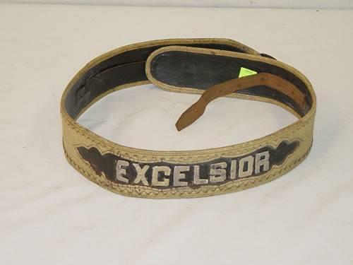 CAIRNS WHITE LEATHER PARADE BELT W/ CUT OUT LETTERS "EXCELSIOR" W/ CAIRNS BRASS TAG (EXCELSIOR HOSE CO. #5 PHILA.) - NORMAL WEAR;