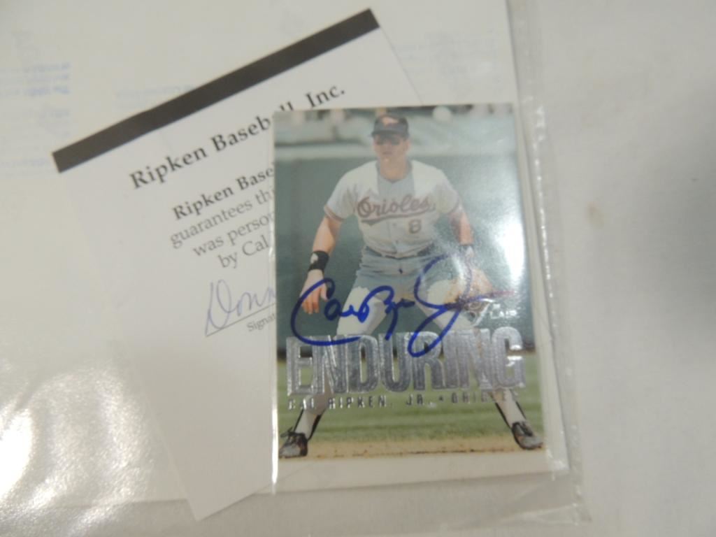 PAIR OF CAL RIPKEN AUTOGRAPHED PIECES. BASEBALL CARD, AND PHOTOGRAPH. WITH COA INCLUDED FROM RIPKEN BASEBALL, INC. AS SHOWN. SEE PICTURES FOR DETAILS. PLEASE BE ADVISED, AND INFORMED REGARDING SIGNATURES OR AUTOGRAPHS THAT WE SELL AT AUCTION: WE ARE NOT AUTHENTICATORS, AND WE DO NOT AUTHENTICATE, OR VALIDATE ANY AUTOGRAPHS OR SIGNATURES THAT WE OFFER AT AUCTION. SOME AUTOGRAPHS OR SIGNATURES MAY COME WITH AN AUTHENTICATION FROM ANY ONE OF LITERALLY HUNDREDS OF AUTHENTICATORS ACROSS THE COUNTRY, AND AROUND THE WORLD. WE DO NOT ENDORSE ANY AUTHENTICATOR, NOR DO WE GUARANTEE THAT ANY AUTOGRAPH OR SIGNATURE IS AUTHENTIC, OR THAT IT WILL PASS AUTHENTICATION BY ANY AUTHENTICATOR. ALL AUTOGRAPHS OR SIGNATURES ARE SOLD