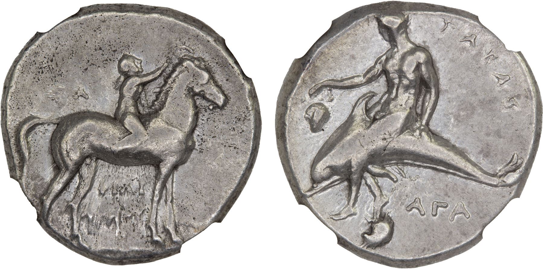 CALABRIA: Tarentum, AR nomos (didrachm), ca. 302-280 BC, Vlasto-673, HNI-960, magistrates Sa-, Philiarchos, and Aga-, rider on horse standing right, crowning it, ΣA to left, ΦIΛI/APXOΣ below // Phalanthos riding dolphin left, holding grape bunch, TAPAΣ to right, AΓA below, uncertain object below Phalanthos' foot, light luster, NGC graded Choice VF