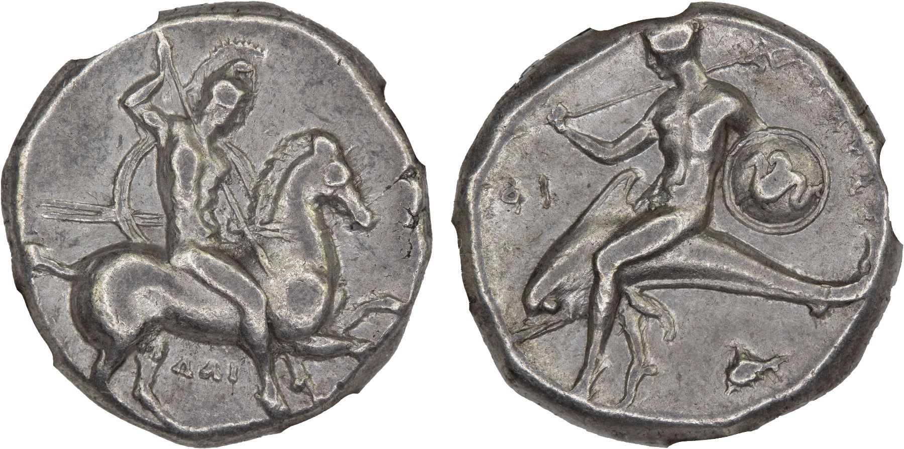 CALABRIA: Tarentum, AR nomos (didrachm), ca. 302-280 BC, Vlasto-594, HNI-935, magistrates Dai- and Phi-, rider on horse galloping right, aiming spear below, holding two other spears and shield, ΔAI below // Phalanthos riding dolphin left, carrying trident over shoulder and shield decorated with hippocamp, ΦH to left, murex shell below, TAPAΣ to right, NGC graded XF