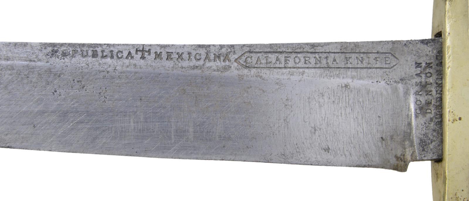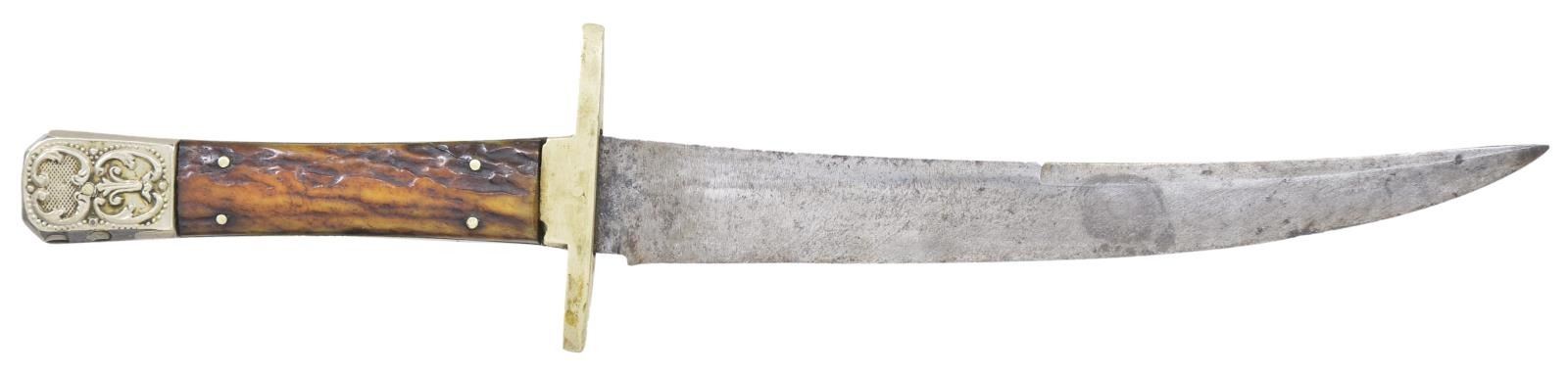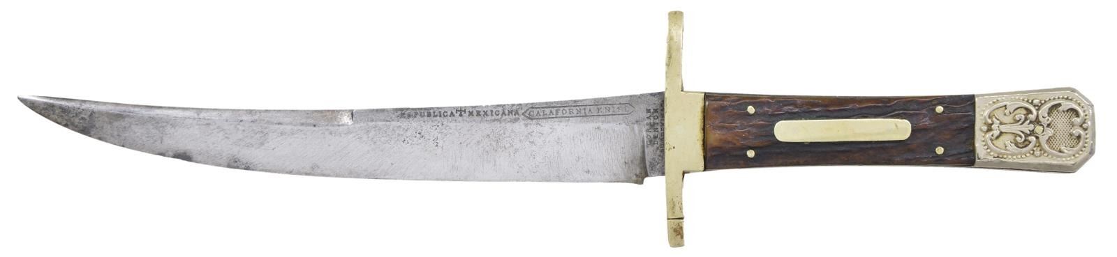 Pictured and described in “A Sure Defense, the Bowie Knife in America”. 10.75” overall, 6.5” long clip point upswept blade. Maker marked on ricasso: “CORSAN / DENTON / BURDEKIN & CO”. “REPUBLICA MEXICANA” & “CALAFORIA KNIFE”[sic] are stamped below top edge. Foliate solder filled bolster and 2.25” heavy German silver crossguard, long escutcheon on stag slab grips. The “stilleto like” blade would be formidable stabbing weapon. Ex-Bill Wright collection. CONDITION: very good overall, gray blade still very sharp, good markings. (02-17216/JS). $2,000-3,000.