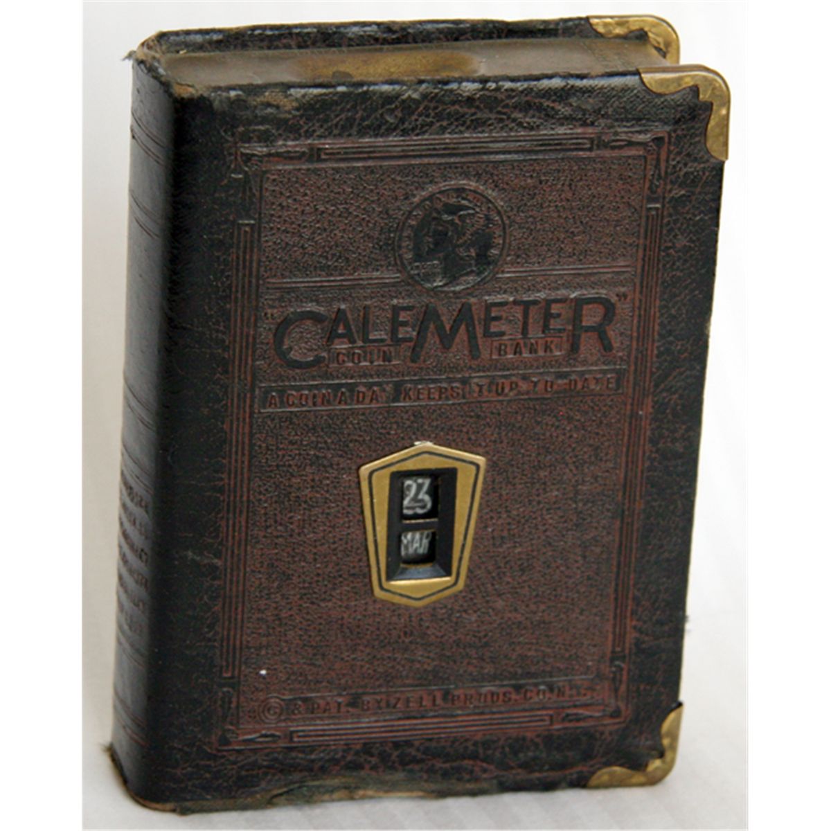 CALEMETER COIN BANK. A Coin A Day Keeps It Up To Date. ‘The Imperial Life Assurance Company of Canada. Regina, Sask. Coin opening at top. Key lock, key present. No serial number. 8cm x 11cm x 2 1/2cm. ‘The Insurance Company assumes, etc.’ on spine. Black cloth or leatherette cover. Maker-Zell Prods. Corp, N.Y. Date window on the front cover. No patent information. Fine.