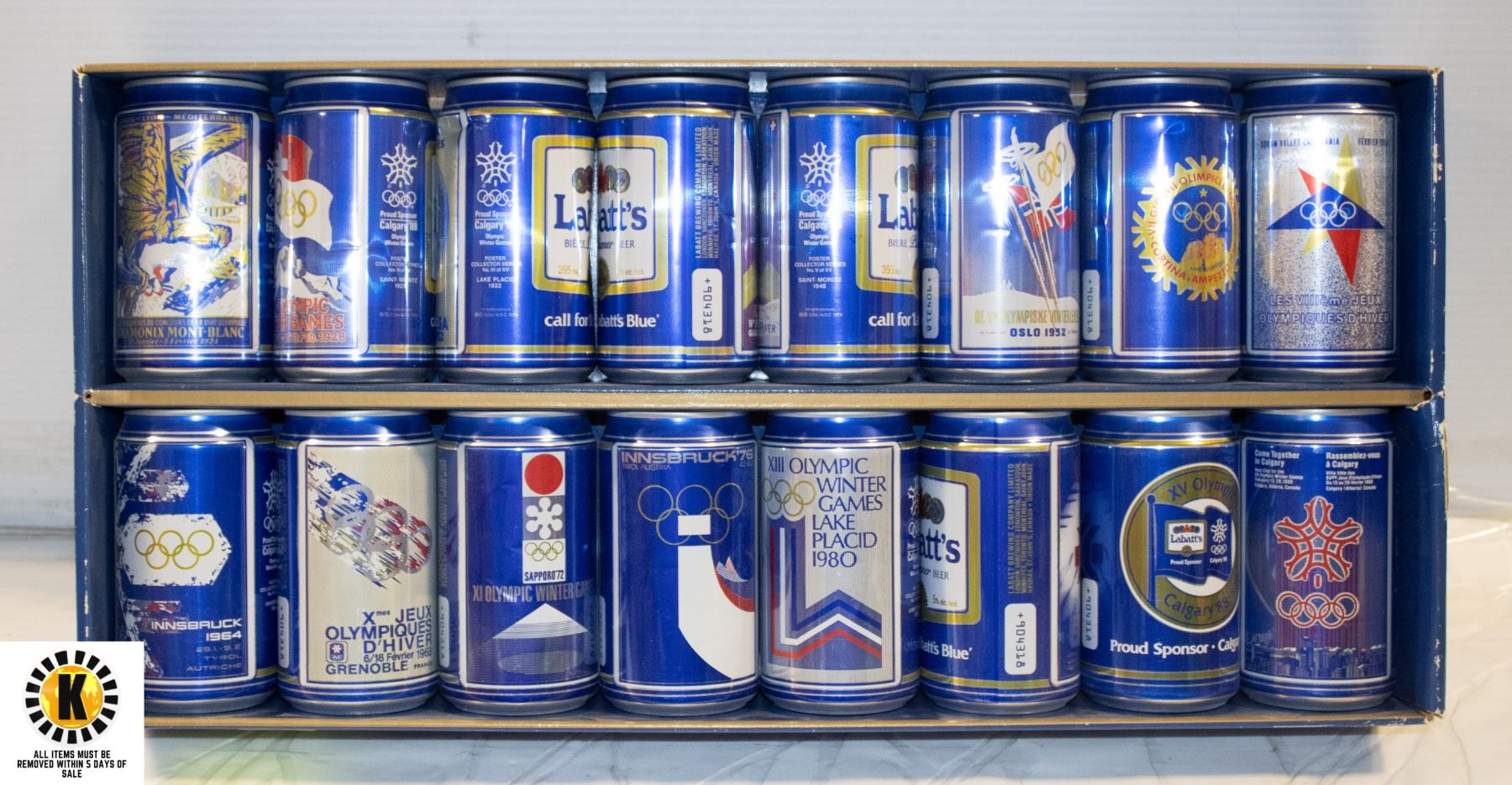 BEER CANS LABATT BLUE BEER CAN COLLECTION. ALL CANS UNOPENED.COLLECTOR CANS ONLY NO BEER INSIDE.REPRESENTS 1924 OLYMPICS TO 1988 OLYMPICS