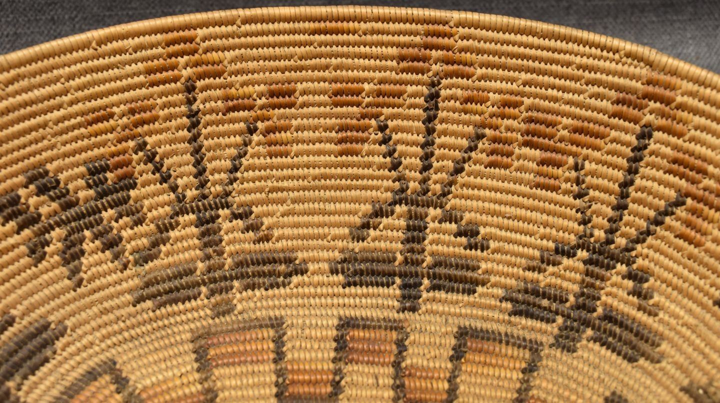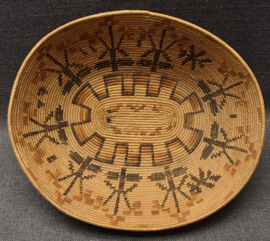 1920's California Mission Diegueno Indian. Hand woven busy design basketry bowl. 4'' x 10.5'' x 12.25''