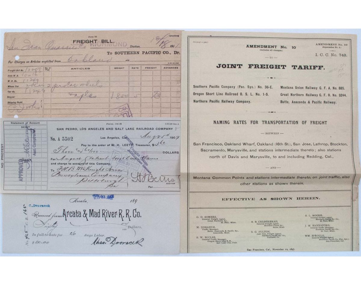 CALIFORNIA R/R EMPHEMERA LOT, 1897-1911, LOT OF 4: Check, Arcata & Mad R.R. Co., Arcata, Cal., dated 1900. 2) Check, San Pedro, Los Angeles And Salt Lake Railroad Company, Los Angeles, Cal., dated 1909. 3) Freight Bill, Southern Pacific Co.,Richmond Station, Cal., dated 1911. 4)Joint Freight Tariff, for 6 different Railroads, dated 1897.