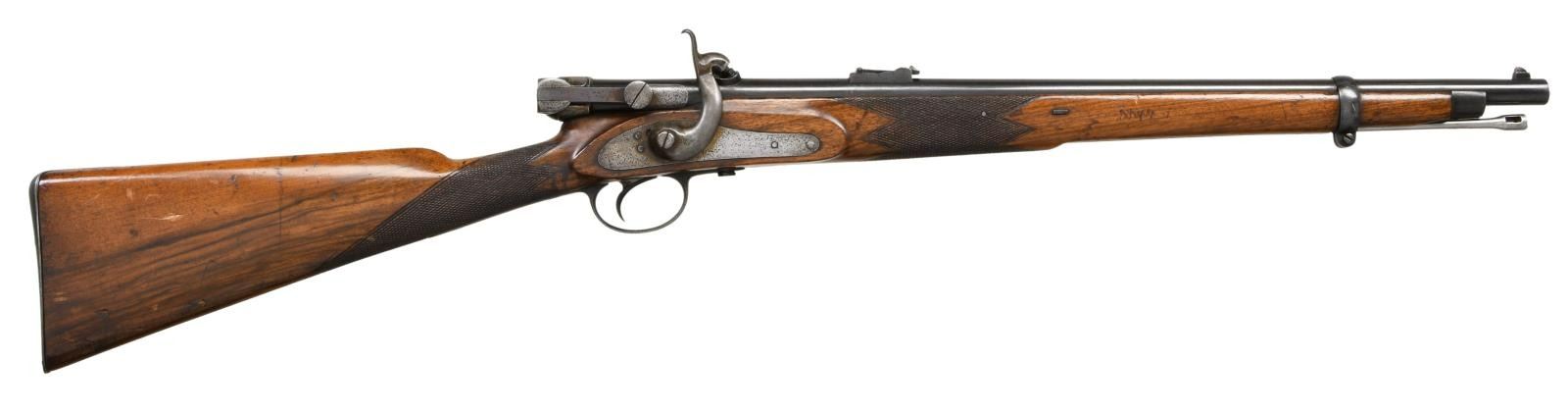 SADDLE RING CARBINE. Cal. 30 Bore. S# 2023. 37.5" overall length. There has always been speculation of the use of these carbines during the Civil War, it is known that JEB Stuart carried one & a presentation example was given to Jefferson Davis. Most examples however saw service in the constabulary in Canada & New Zealand, though no constabulary marking present on this example. Engraved serial number on trigger guard tail, all furniture is iron, barrel attached to stock by single key, 4" saddle ring bar. "Terry's Patent" hinged rotating lever for breech loading 20" barrel, 4" breech. No British government proof marks; a single commercial proof at the breech. CONDITION: very good as refinished, complete and original. Metal is pitted and refinished, reblued, with only partially discernible markings on lock, & no markings visible on barrel, engraved serial number on lower tang only partially discerned. Stock is sound, sharp checkering, old varnish, scattered scuffs and scratches. Ramrod polished bright with partially discernible maker's name. Cleaning jag still present in buttstock cavity. Mechanically fine, good rifled bore with pitting. (01-23162/JS). ANTIQUE. $2,500-3,000.