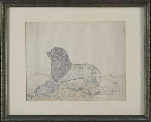 CALLIGRAPHY OF LION AND MAN. A pen drawn standing lion stands over fallen man wearing pith helmet. Signed lower right “Grant Mellott, Mattie, PA”. Housed in an early 19th Century decorated wood frame with white matte. SIGHT SIZE: 11-1/2” x 14-1/4”. CONDITION: Paper has some horizontal tears and creases, otherwise good. 9-27820