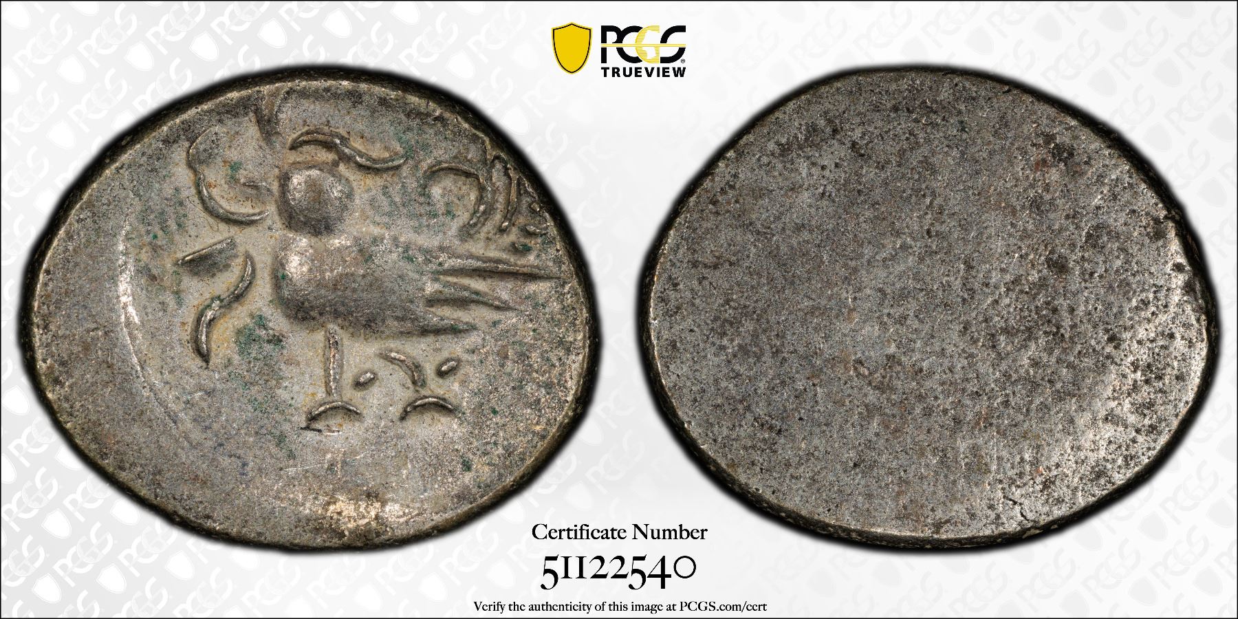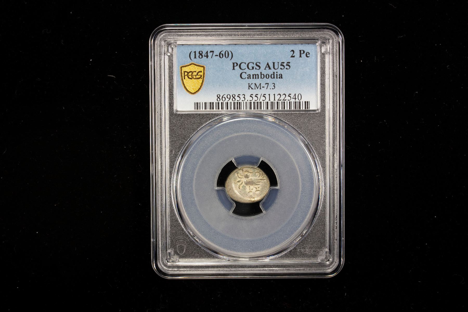 CAMBODIA: Ang Duong, 1847-1860, AR 2 pe (1/2 fuang), KM-7.3, stylized Rooster with short crude feathers, a lustrous example, PCGS graded AU55.