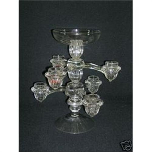 </font></strong>This is a wonderful set of Cambridge Arms. The Cambridge arms pattern was made by the Cambridge Glass Co. of Cambridge, OH circa 1940's, I believe. This set consists of 1 #628 base unit, 2 #1563 3 lite candle holders and 1 #1536 bowl insert. The unit is 10-1/2" high, 9" wide and the diameter of the bowl and the foot are each 5". With six candles burning and the bowl full of flowers it makes a beautiful display. There may be some bubbles and straw marks but there are no chips, flakes or cracks. </font>