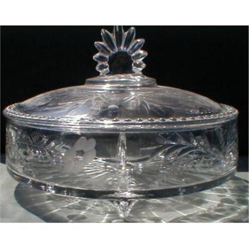 Great VINTAGE elegant depression glass etched glass footed candy dish with cover. Three-part