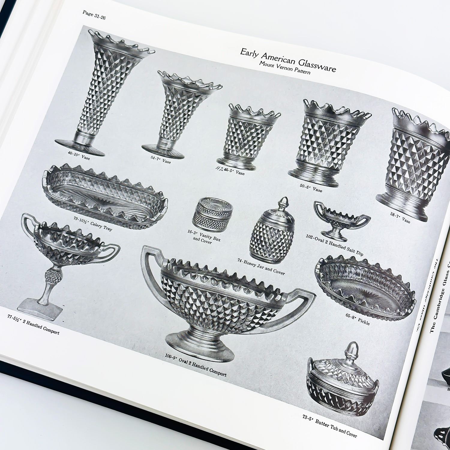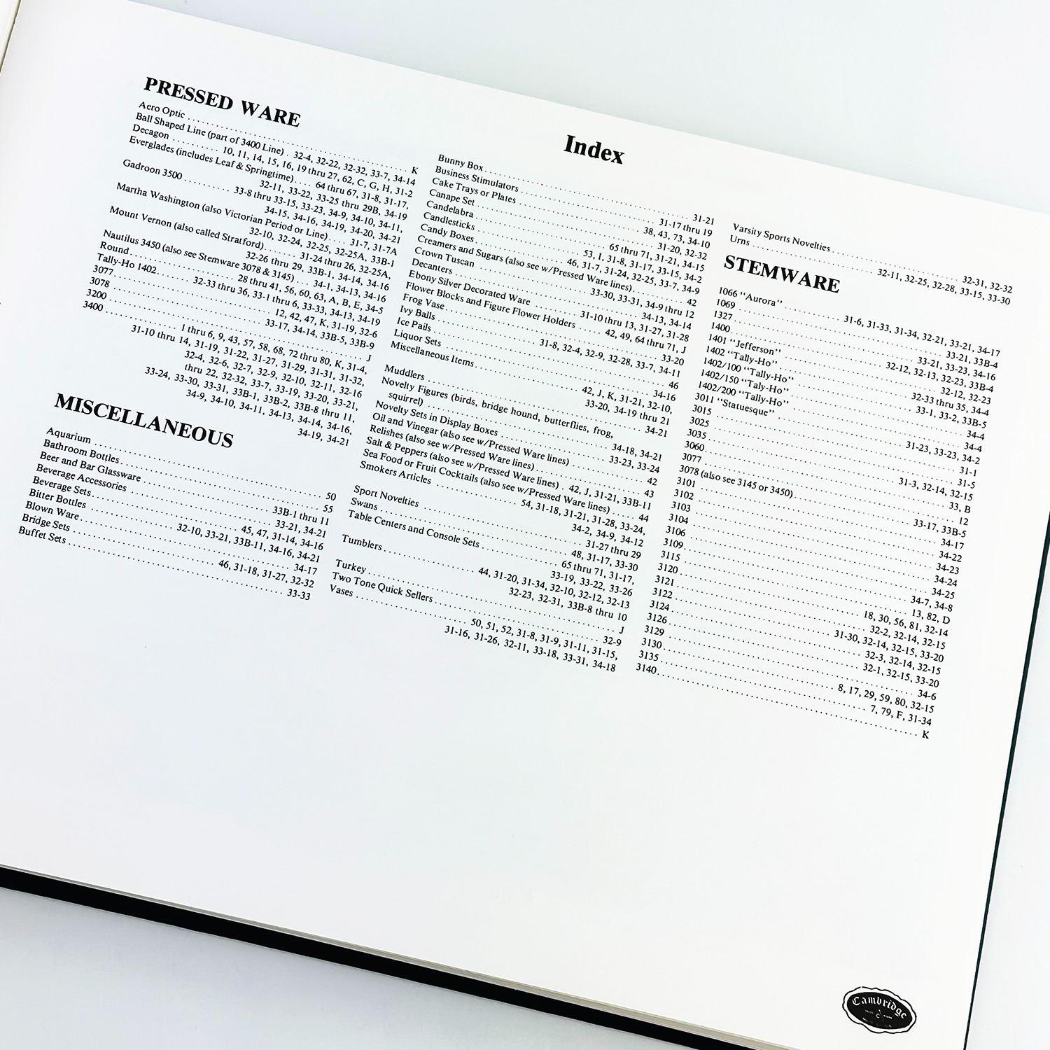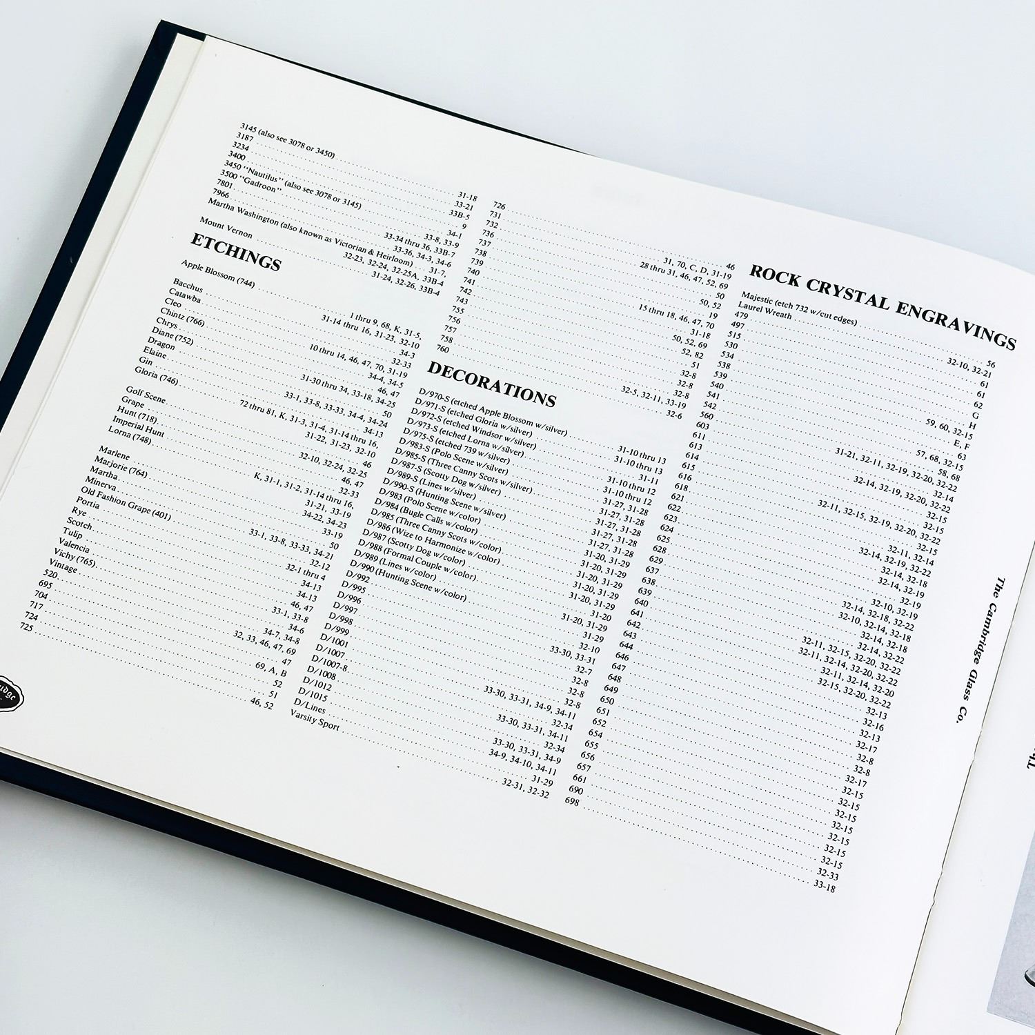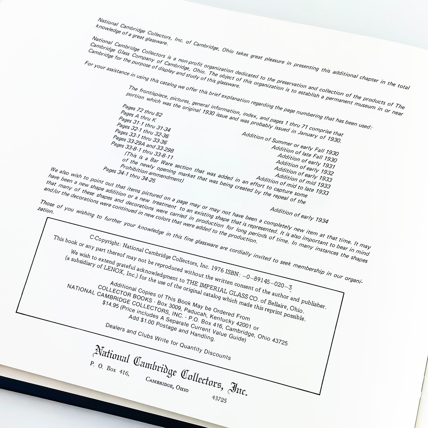 #8290 - VINTAGE - THE CAMBRIDGE GLASS CO. HARDCOVER COLLECTOR GUIDE BOOK. BOOK COVERS CAMBRIDGE GLASS FROM 1930 THRU 1934. ILLUSTRATED GLASS IDENTIFICATION GUIDE. COPYRIGHT 1976 NATIONAL CAMBRIDGE COLLECTORS, INC. MEASURES: 11.25” (28.5 CM) BY 8.75” (22.5 CM)
