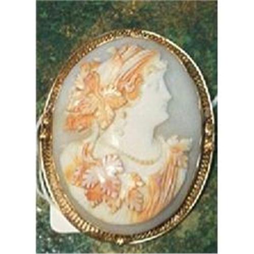 Outstanding high relief master carved 3 inch cameo broach/necklace depicting Bacchante Maiden, follower of Dionysus (Bacchus) god of wine and fertility with grape and grape leaves in her hair. This cameo is in a gold setting filligree frame measuring 3 inches by 2 inches can be used as a broach but has a loop for a necklace setting. The composite picture shows the reverse carved procedure allowing the natural beauty of the shell coloring to be reflected in the design. This is a stunning cameo from my daughter's private collection.