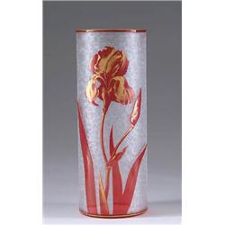 Lot 850 CAMEO IRIS VASE Beautiful cameo vase features red cameo iris flower with gilt highlights against a clear acid textured background. Vase is unsigned but is probably St. Louis or Baccarat. SIZE: 9-3/4” t. CONDITION: Very good to excellent. 5-71067