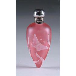 Lot 56 CAMEO LAY-DOWN PERFUME Attributed to Webb. White floral design with butterfly and Sterling lid. SIZE: 4” l. CONDITION: Very good, minor dents to lid. 5-70466