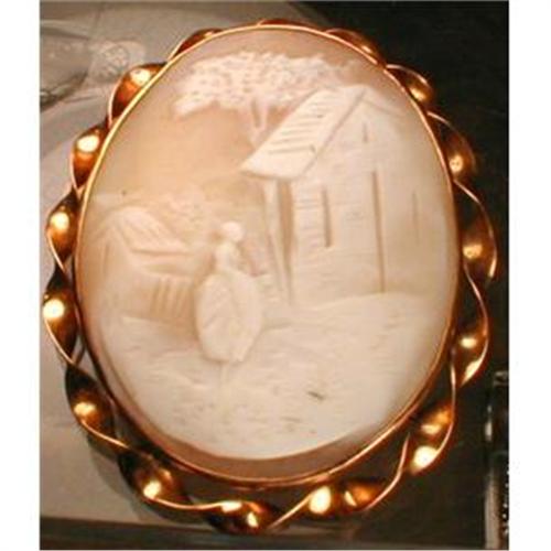 Wonderful shell cameo: Rebecca at the Well - in 14 karat gold setting.