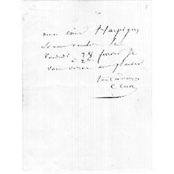 <b>442. CAMILLE COROT</b> (1796 - 1875)<b> </b>French painter identified with the Barbizon school and whose style anticipated later Impressionists, who also drew on much of his work. Brief A.L.S.<b> </b>1p. sm. 8vo., [Paris, Oct. 3, 1868], in French to his friend and fellow French painter HENRI-JOSEPH HARPIGNIES (1816 - 1916), whose landscapes much resembled those of Corot. In full: "<i>My dear Harpigny, If you prefer Friday the 28th of February at 2:00 PM, I would come with pleasure. With my best to you, C. Corot</i>". Tipped to a larger sheet, with the original holograph envelope, overall very good condition.<b> $400-500</b>