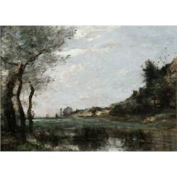 CAMILLE COROT France 1796-1875 Bateliers sous l’arbre à la branche cassée Signed Corot. Oil on canvas, 46 x 61 cm. Made around 1865 Jean Babtiste Camille Corot started, according to his father’s will, in a weaving mill. Determined to become a painter, he succeeded in obtaining economical support from his father in order to study painting. He started in the studio of Jean-Victor Bertin. All his life Corot was a travelling painter. He made several trips to Italy, 1825-1828-1843. He visited Fontainebleau, Normandy, Brittany, Chartres, Dunkerque, Boulogne-sur Mer, Berck. He went later on to Burgundy, explored le Nivernais and Auvergne. In 1841-1842 he travelled to Switzerland, in 1854 to Holland, to London in 1862, to Auvers-sur-Oise in 1868 etc. He regularly exhibited at the Salon de Paris from 1827, getting his paintings refused in 1843 and 1847, but obtained his first medal in 1848, as well as several other distinctions in the years to come. He became Chevalier de la Légion d’Honneur in 1846. From his early years Corot was influenced by the néo-classical movement, but started to paint “plein air“ and showed a special interest in landscapes, an interest that developed fully during his first journey to Italy. The landscapes of Corot can at the same time arouse enthousiasm in the dilettante of classical landscapes, who compares them to Poussin or Lorrain, as being not only copies of nature but well made compositions, as well as they can be appreciated as romantic and poetical dreams - precursors to the impressionist movement. A landscape by Corot has only an illusory simplicity, in reality it is much more complex. PROVENANCE: Vente Corot, 4 december 1880, Seymour collection EXPERTISE: Martin Dierterle certificat nr 2595