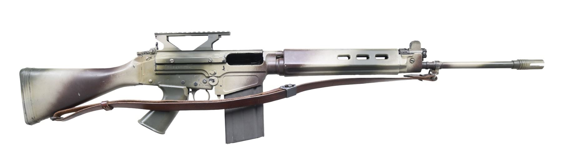 Cal. 308. S# DS25150. Bbl. 22 1/2" over brake. DS Arms has long been the gold standard for FAL style firearms & w/ good reason. This particular SA58 rifle has a threaded 21" barrel, Vortex style muzzle brake & rock-solid op-rod adj. gas system. Combination Flat Dark Earth, Green & Brown camouflage pattern covers all external components. Left side, non reciprocating charging handle. Left side, enlarged safety / selector. Metric pattern receiver. Protected post front sight w/ sliding rear peep sight marked from 200-600m. Heavy duty scope mount in above action allows the use of original iron sights, while providing 6" of picatinny rail space for optic mounting. Slim, vented forend. Composite pistol grip & matching shoulder stock w/ hard rubber recoil pad. Sling swivels at 6 o'clock front & rear, currently sporting leather sling. MAGS: 1-20 rd. steel. CONDITION: coverage is complete & consistent, showing some wear in the form of scattered scratches & drag lines throughout. Bore is bright w/ strong rifling. Fire control mechanism appears to function correctly when cycled by hand. PROVENANCE: From the Lifelong Collection of George Staden S&W Member #3451. (25-19/JZ). MODERN. $800-1,200.