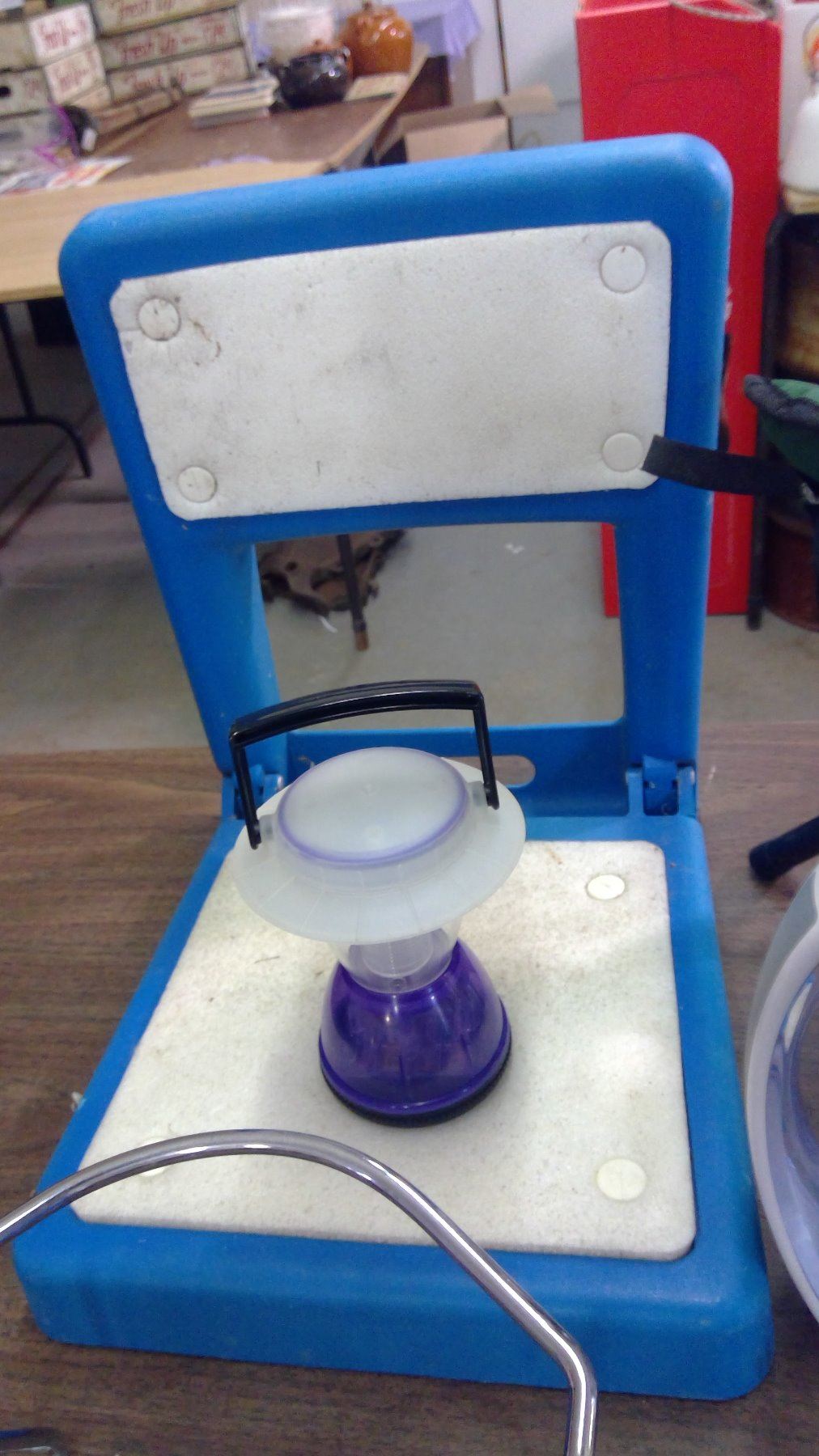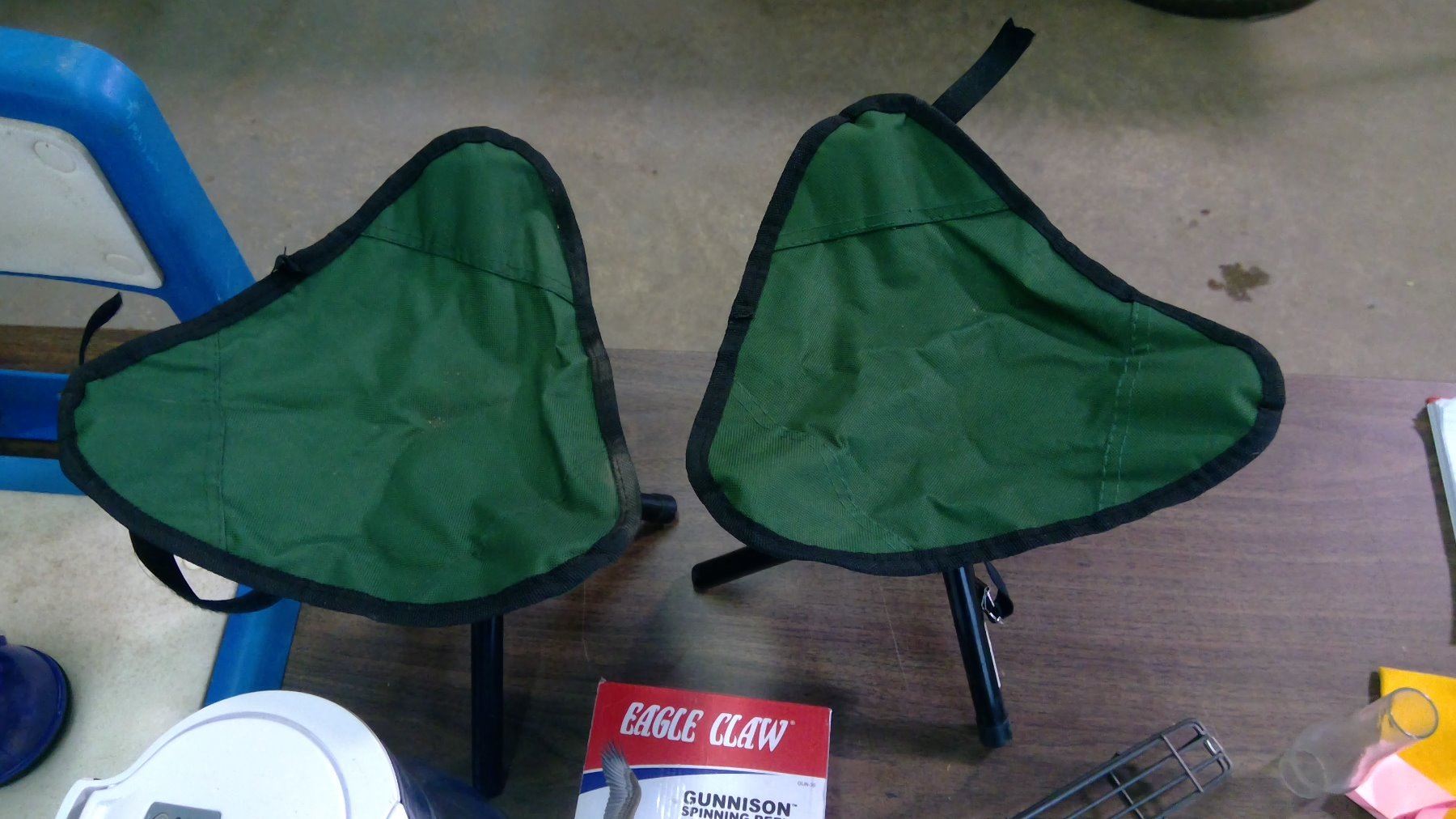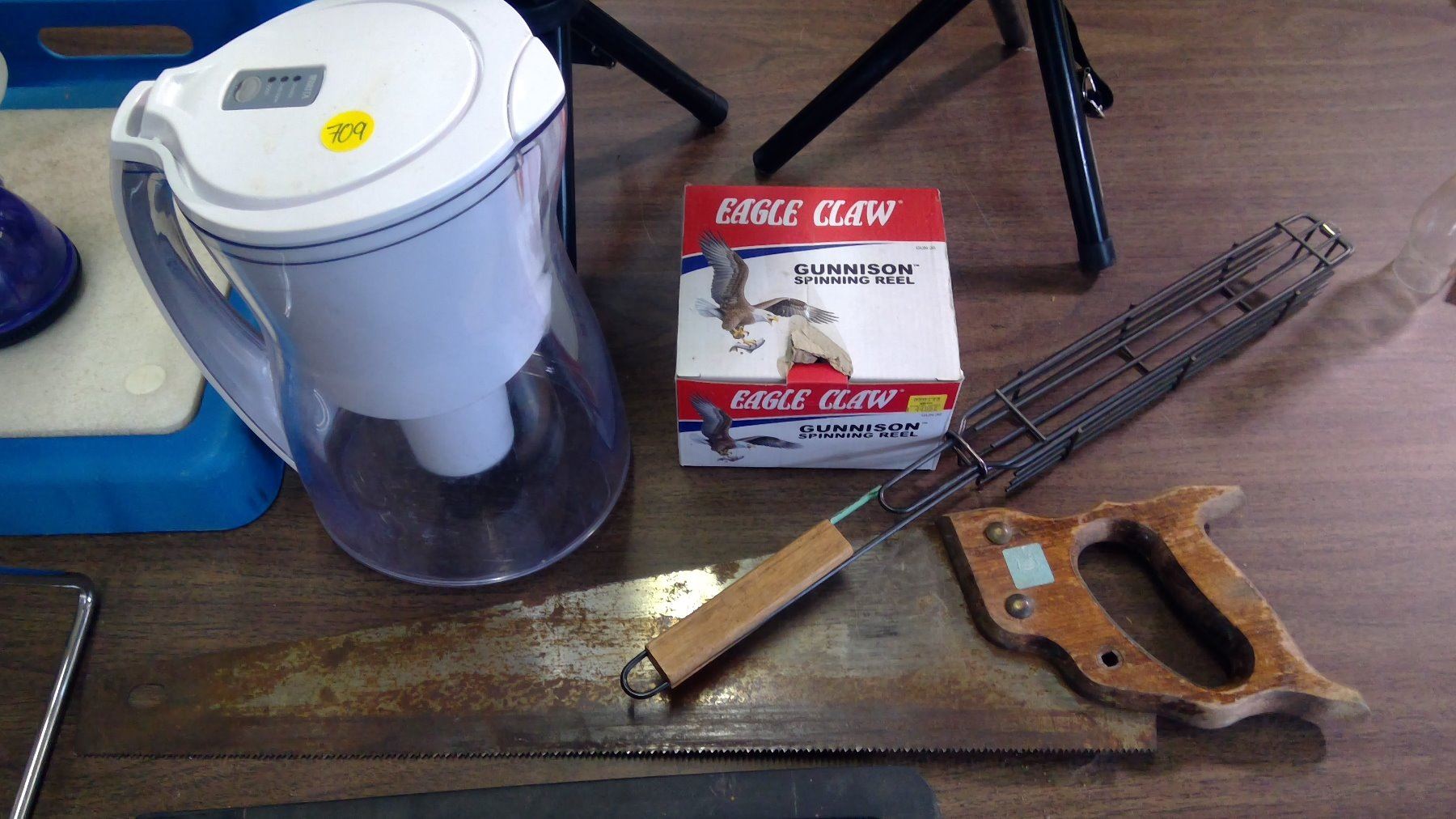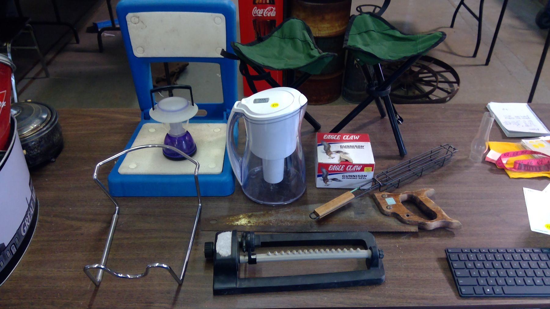 CAMP/OUTDOOR LOT WITH 2 SMALL CAMP CHAIRS, HOT DOG COOKER, WATER JUG HOLDER, SPRINKLER, SAW, LANTERN ETC