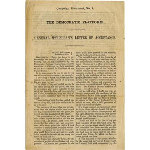 <B>CAMPAIGN DOCUMENT NO. 1 McCLELLAN’S LETTER OF ACCEPTANCE, 1864.</B></I> Six page printed document, 5.75”x 8.75”. <I>“Gentlemen: I have the honor to acknowledge the receipt of your letter informing me of my nomination by the Democratic National Convention, recently assembled at Chicago, as their candidate at the next election for President of the United States...”</B></I> <BR><BR><B>Provenance: </B></I>Al. Emmett Fostell Collection<B> </B></I><BR><BR><B>Condition:</B></I> Very good, last page torn upper right corner missing, does not affect printed matter.<BR><BR><b>Shipping:</b> Miscellaneous Collectibles, Smal (<a target="_blank" href="http://www.heritageauctions.com/common/shipping.php">view shipping information</a>)